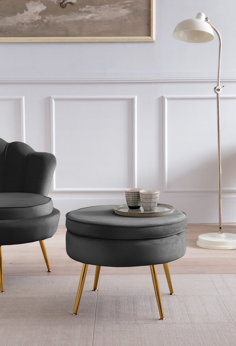 Deze design poef is een echte eyecatcher in je interieur. Plaats deze in de woon- of eetkamer. Ook zeer geschikt voor in een ontvangstruimte. De poef is bekleed met sterke en slijtvaste fluwelen stof, deze kenmerkt zich door zijn zachtheid. De goudkleurige metalen poten maken dit meubelstuk af. Gemakkelijk te monteren doormiddel van bijgeleverde montagehandleiding. Leuk te combineren met de andere elementen uit deze serie!