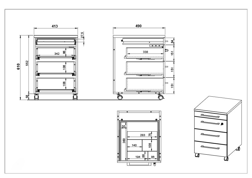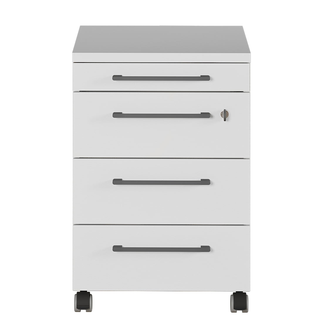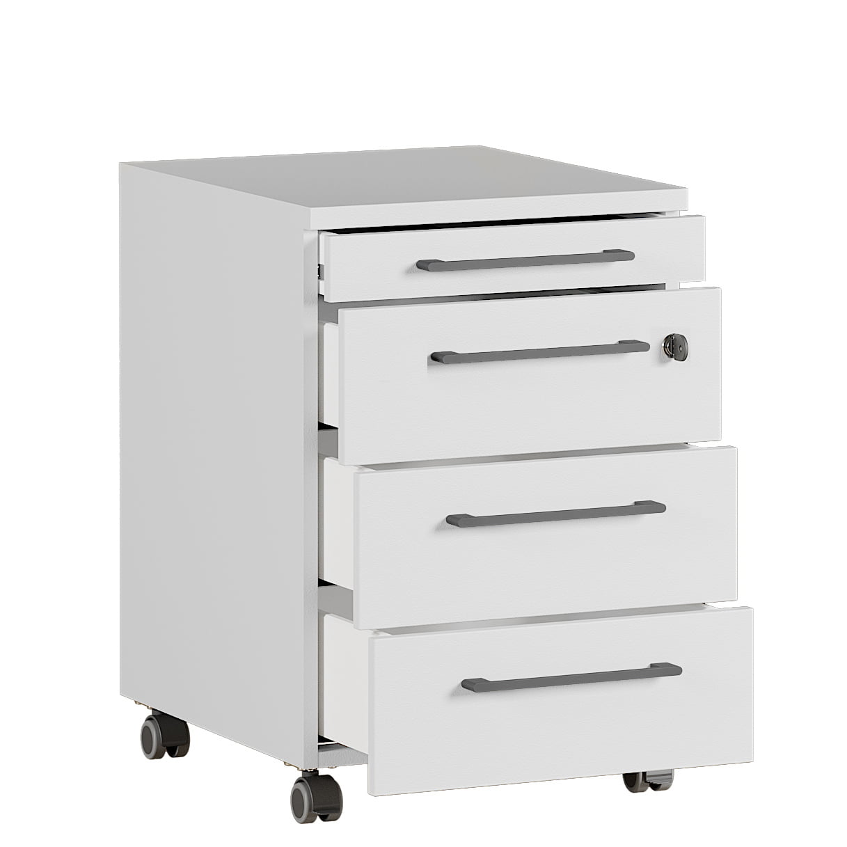 Deze handige rolcontainer kan onder elk bureau toegepast worden. Bovenin is een lade voor de kleine kantoorbenodigdheden met daaronder 3 afsluitbare laden. Uit veiligheidsoverweging kan er 1 lade per keer worden geopend. Dus geen 2 of 3 laden tegelijkertijd.