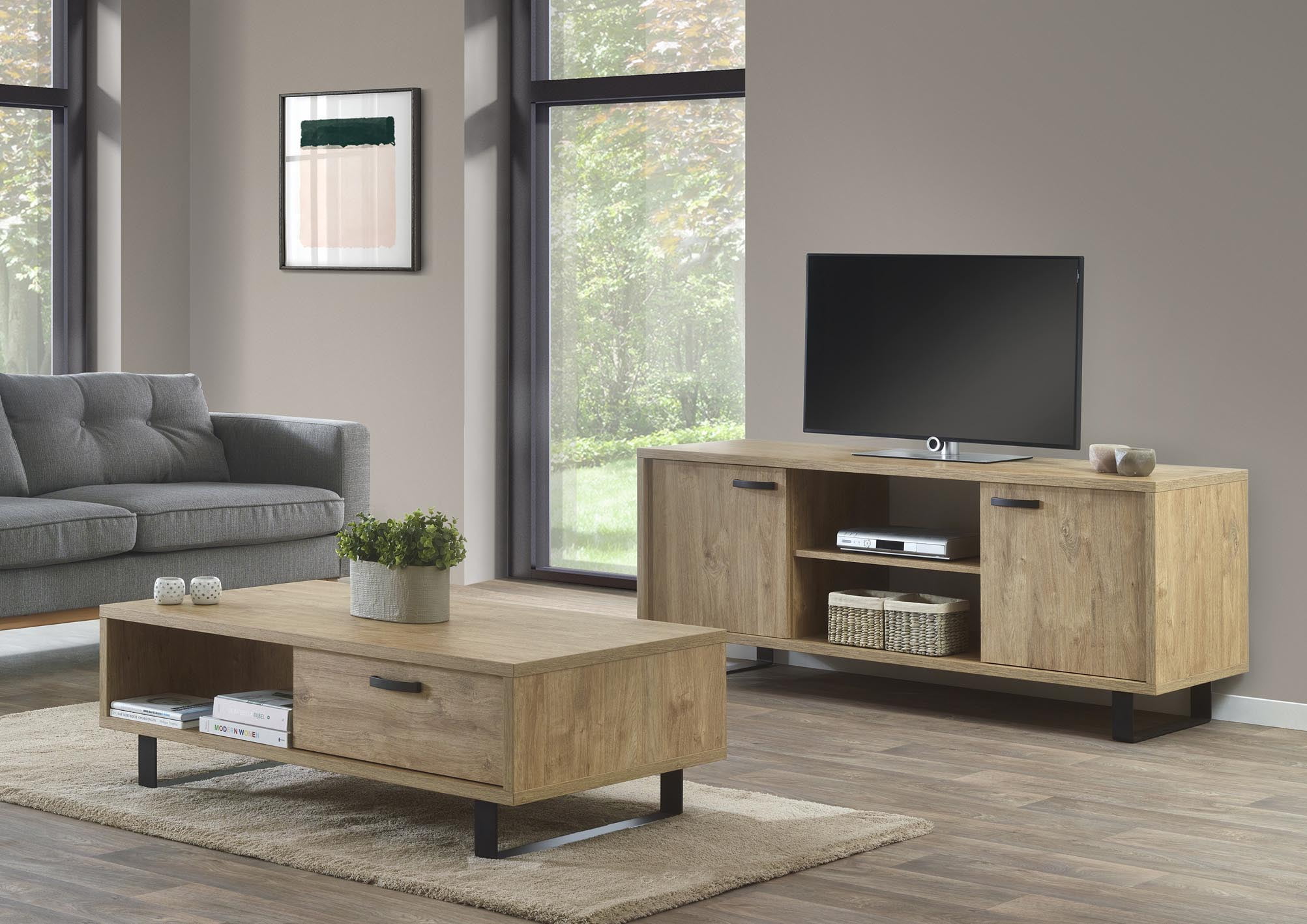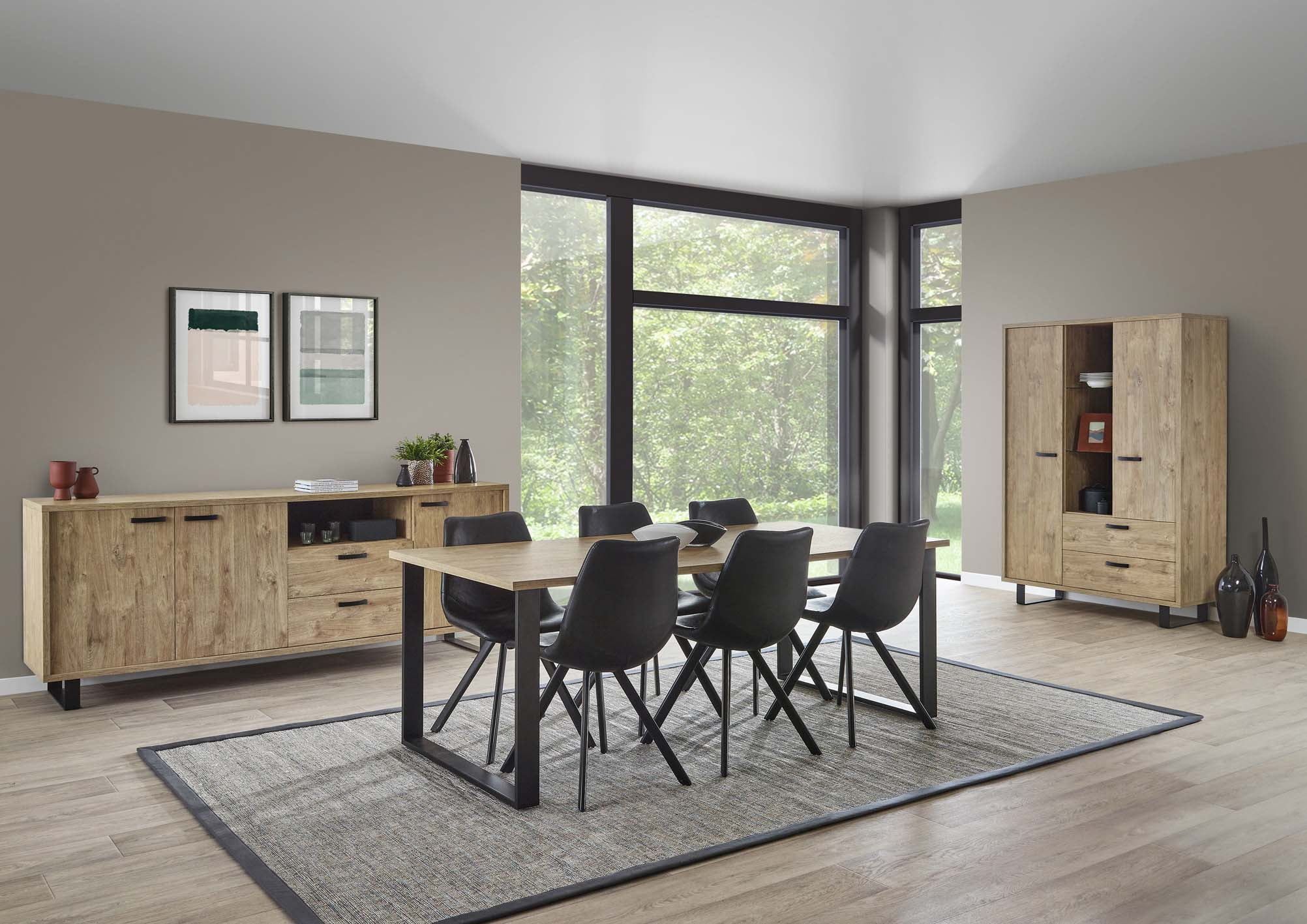Met dit prachtige woonkamerprogramma ben je snel voorzien van alle benodigde meubels. Deze serie heeft alle elementen om je woonkamer of eetkamer in één keer helemaal in te richten. Door het gebruik van zwart metalen frames in combinatie met de warme eiken afwerking maakt dit een moderne serie die snel zijn plaats vindt in elk interieur.