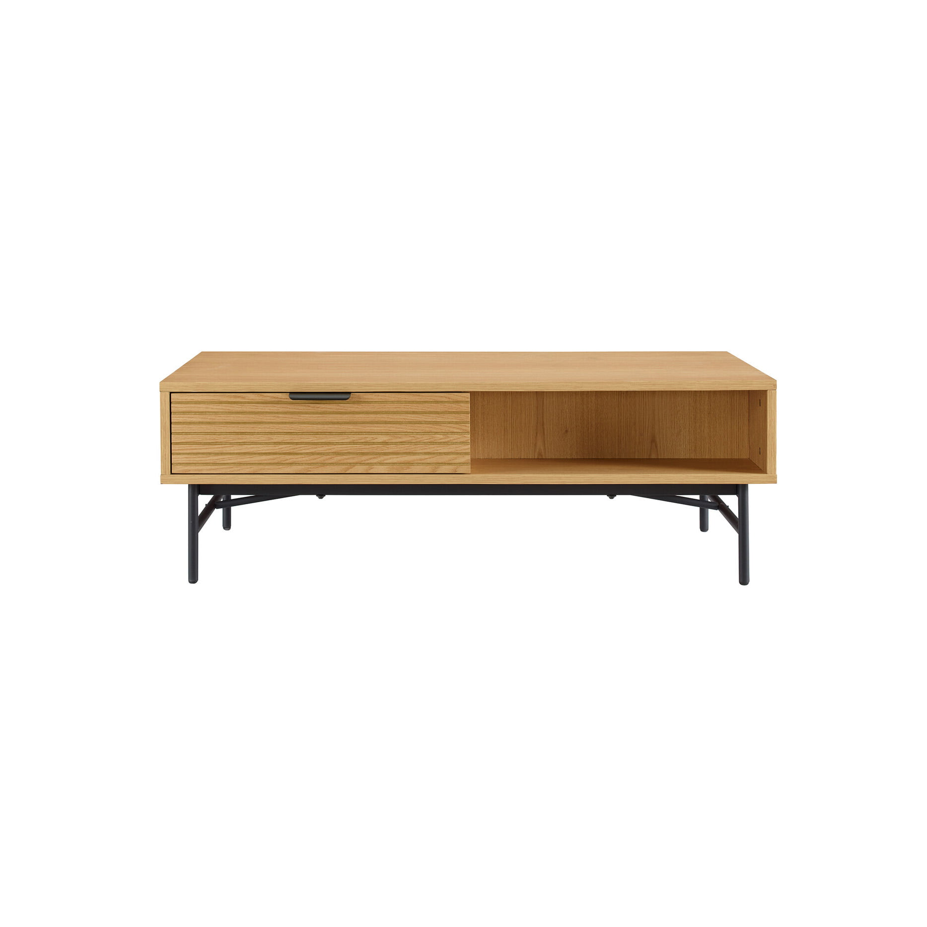 De laden en deuren van deze salontafel sluiten geruisloos dankzij de soft close functie. Het meubel is vervaardigd uit een combinatie van MDF en melamine, afgewerkt met een eikenfineer. Het stevige metalen frame is zwart gepoedercoat en daardoor krasbestendig. Gemakkelijk te monteren doormiddel van de bijgeleverde montagehandleiding. Leuk te combineren met de andere artikelen uit deze serie!