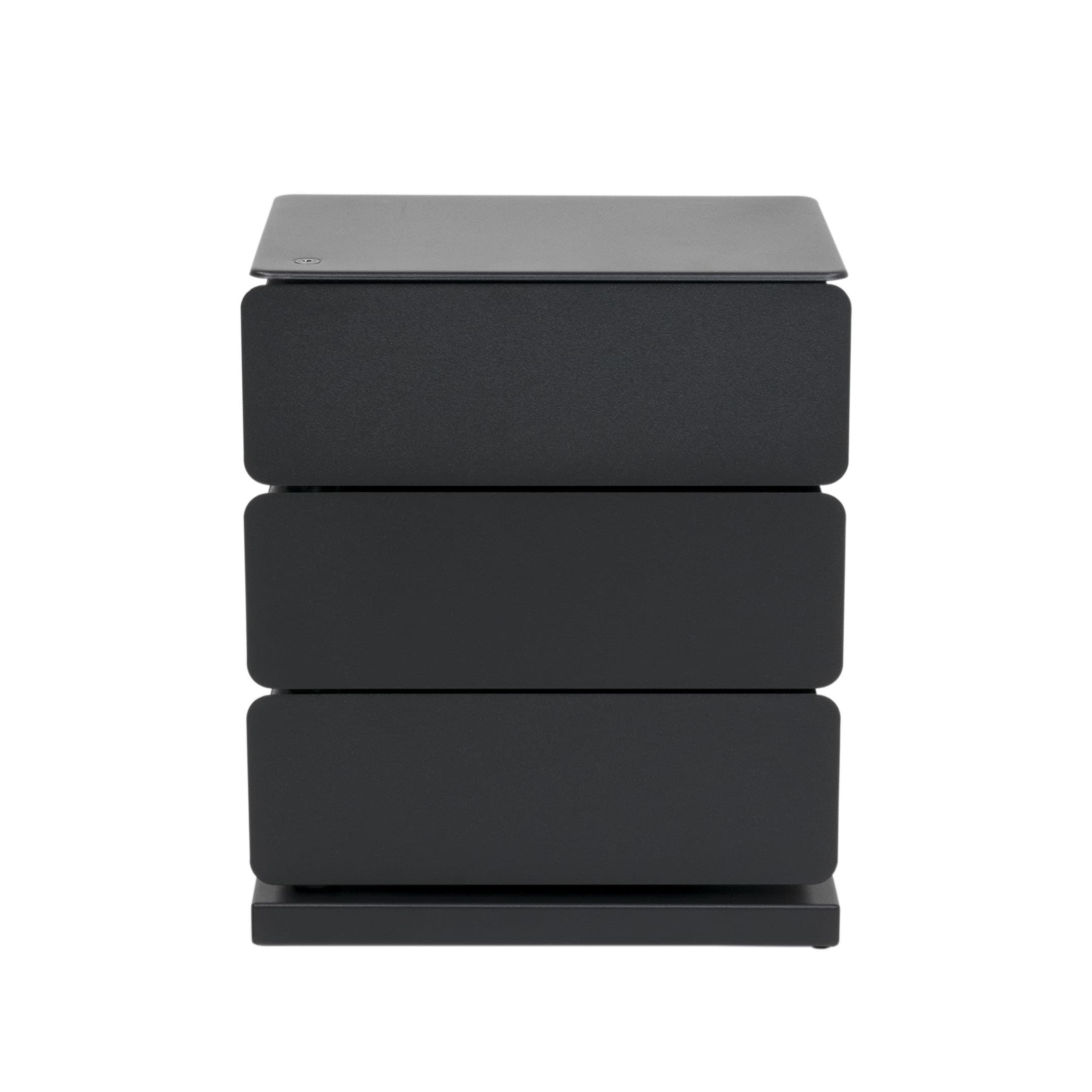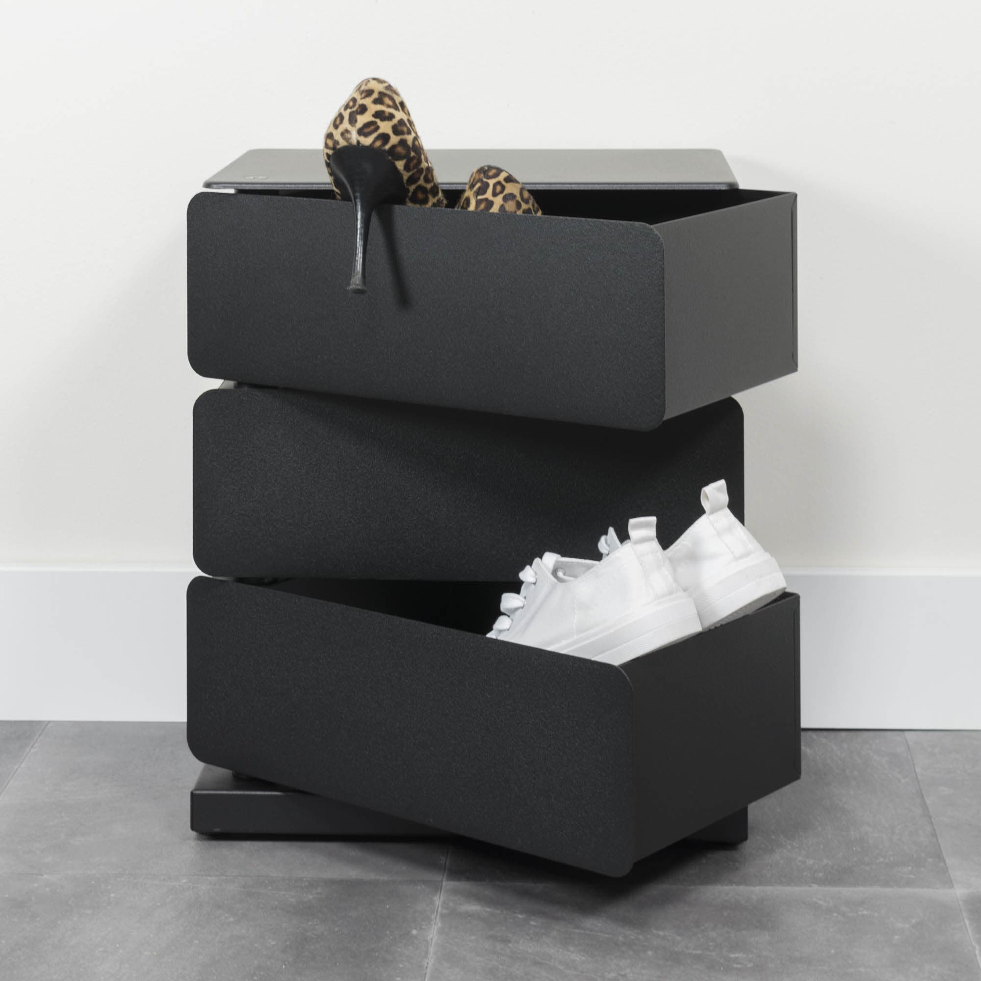 Met deze strak afgewerkte schoenenkast haal je een eyecatcher in huis! Kan zowel als ladekast of als schoenenkast (tot maat 42) worden gebruikt, gemaakt van hoogwaardig metaal en afgewerkt met een sterke zwarte lak.