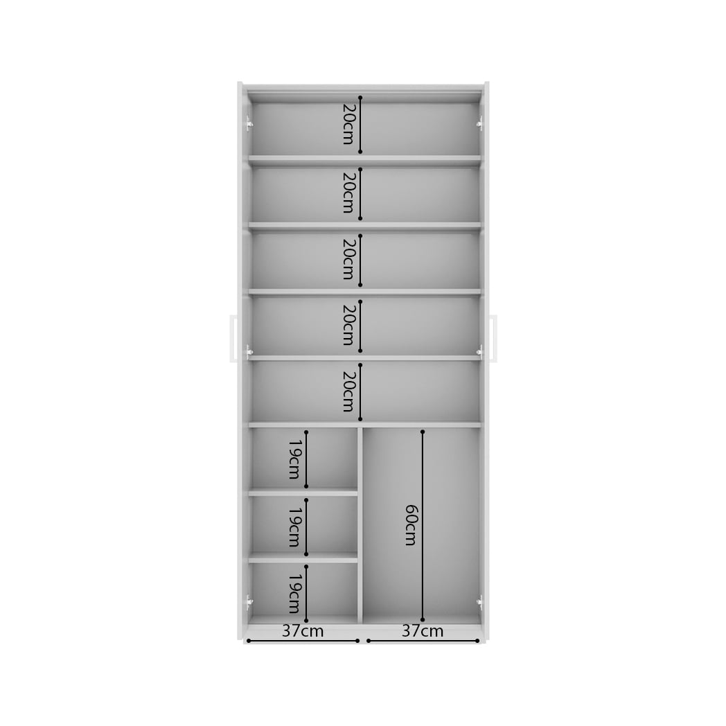 Met deze handige schoenenkast heb je voldoende opbergruimte voor al je schoenen. Achter de dubbele deuren bevinden zich in het bovenste gedeelte 5 brede vaste legplanken. In het onderste gedeelte bevinden zich 3 kleinere compartimenten en 1 groot compartiment, ideaal voor bijvoorbeeld laarzen. De schoenenkast is 80 centimeter breed, 37 centimeter diep en 183 centimeter hoog. Verkrijgbaar in meerdere kleuren en afmetingen.