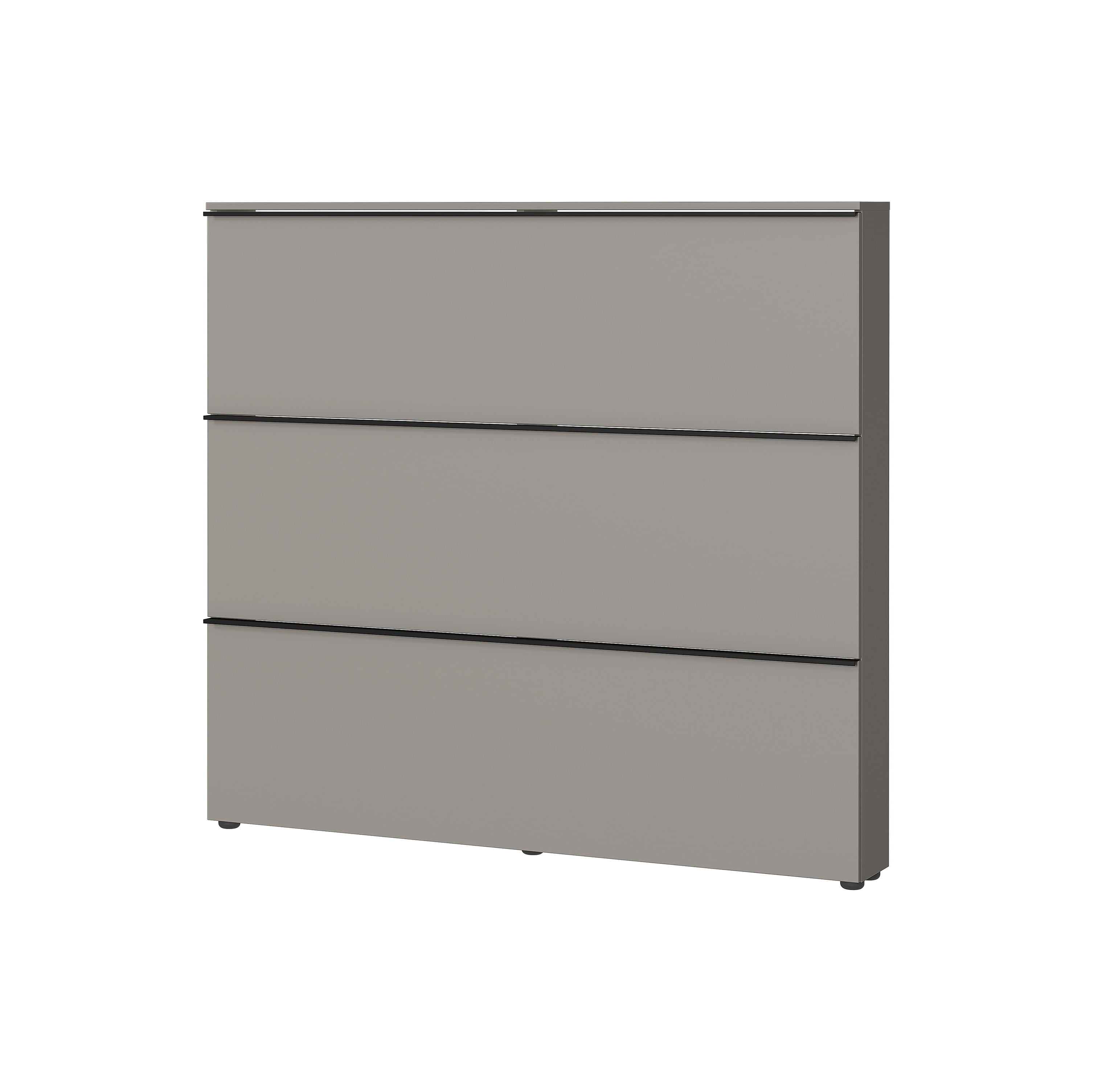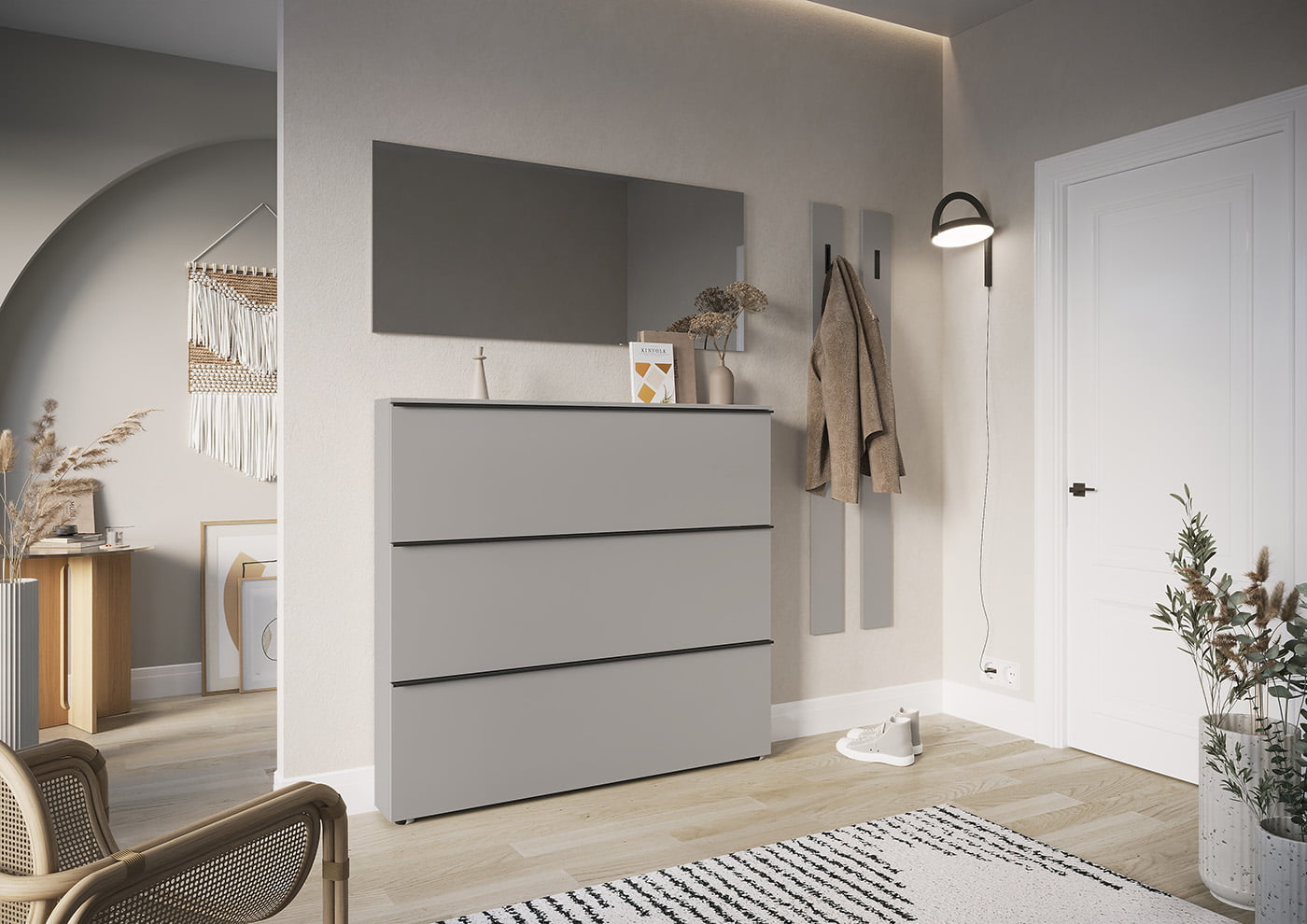 De Schoenenkast Miles Grijs biedt ruimte aan al je schoenen met zijn drie kleppen en in totaal zes schoenmanden, elk met een draagvermogen tot 15 kg.