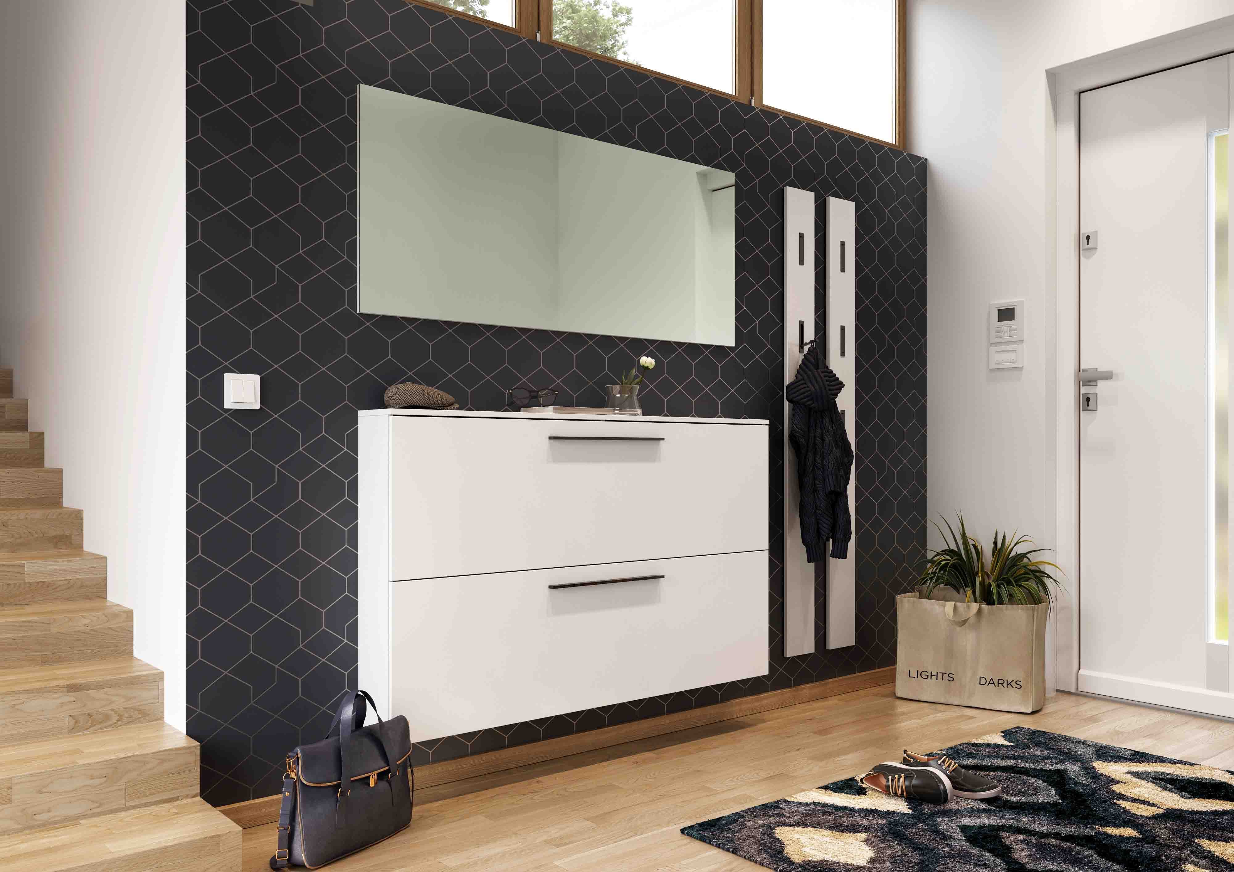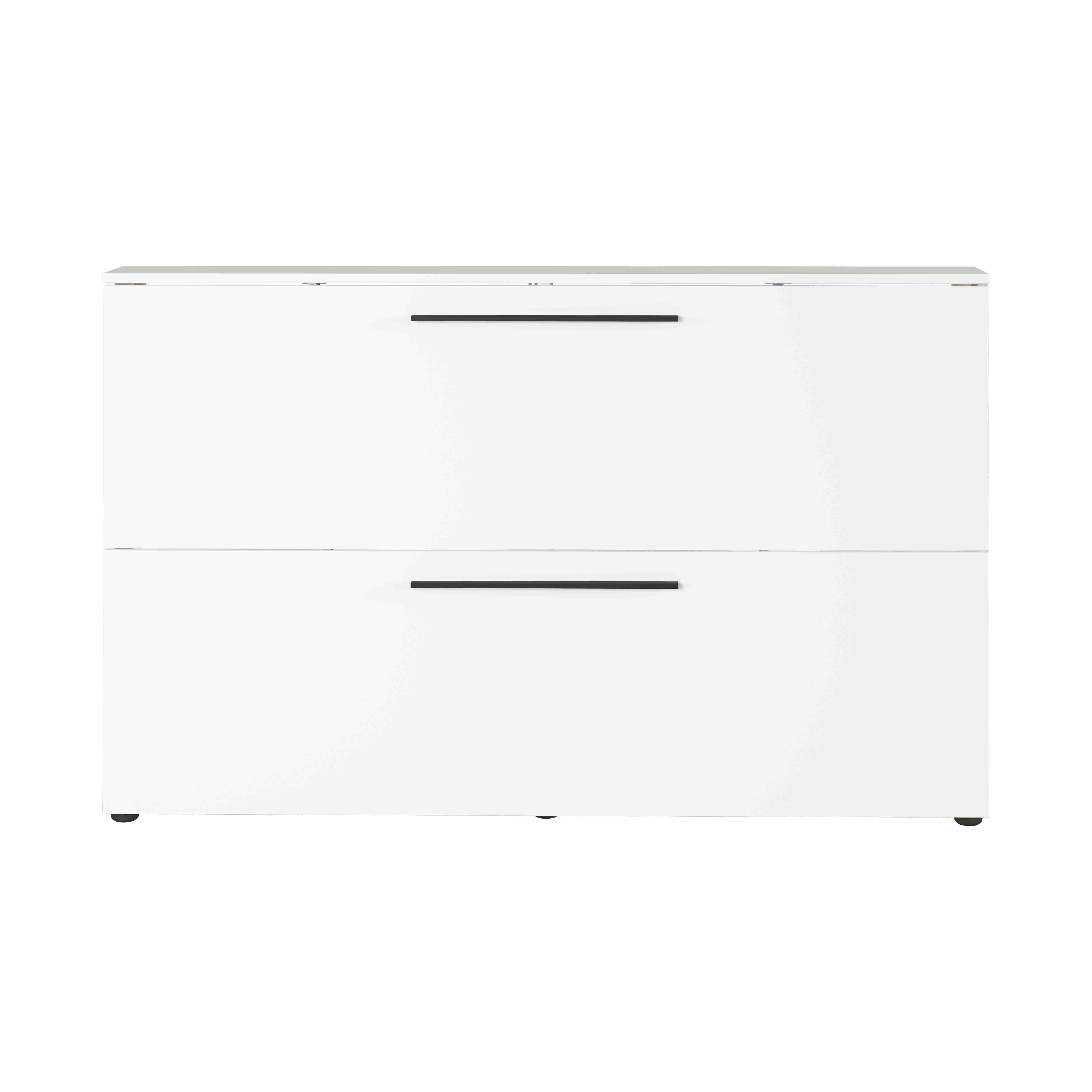 Met deze prachtige efficiënte schoenenkast is je hal snel opgeruimd! De schoenenkast heeft 2 vakken waarachter je ongeveer 12 paar schoenen kunt opbergen. De handvatten van gepoedercoat zwart metaal geven een mooi contrast aan het meubel. De meubelen uit deze prachtige serie geven elke hal een moderne stijlvolle look. De meubelen zijn gemaakt van hoogwaardige Duitse kwaliteit. Door een sterke melamine afwerking in combinatie met een ABS-kantafwerking ben je met deze meubels verzekerd van een lange levensduur. De meubels zijn eenvoudig te monteren met behulp van een duidelijke montagehandleiding. Leuk te combineren met de andere meubels uit deze serie!