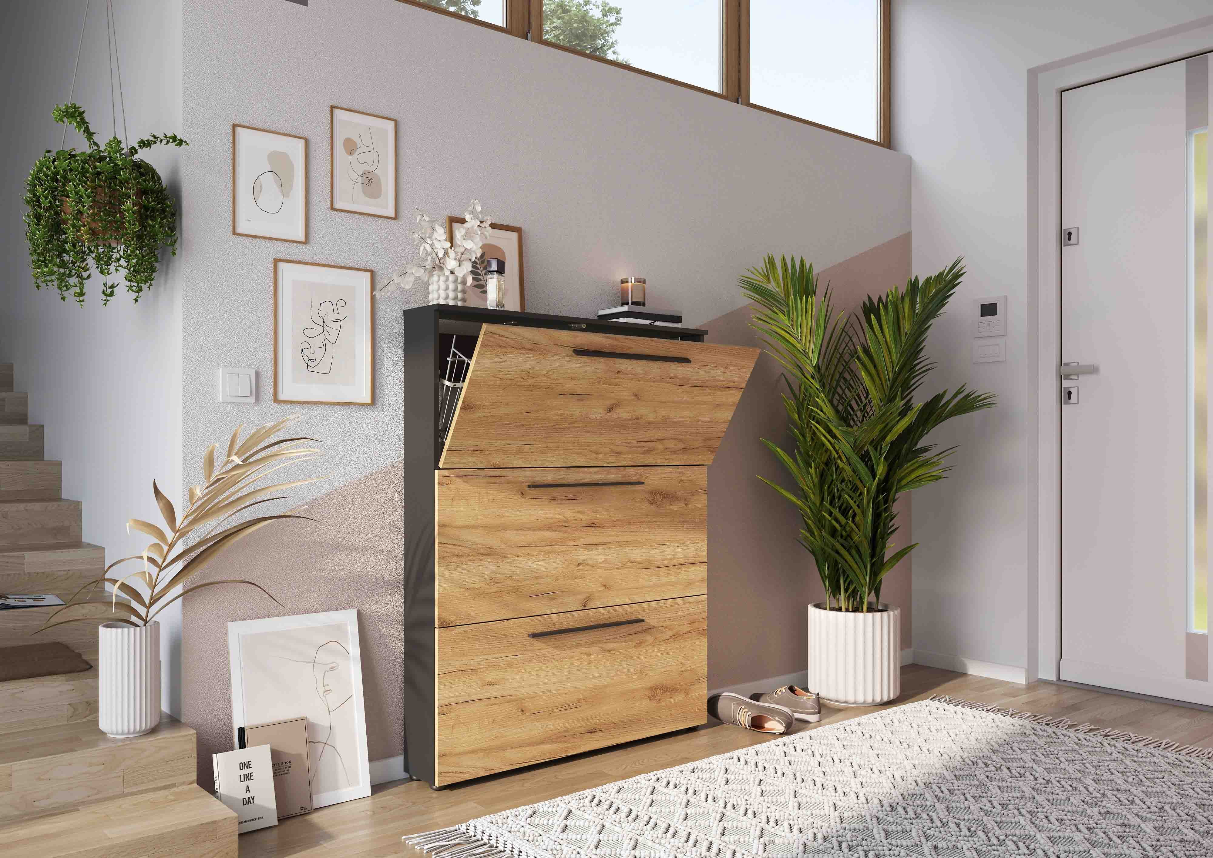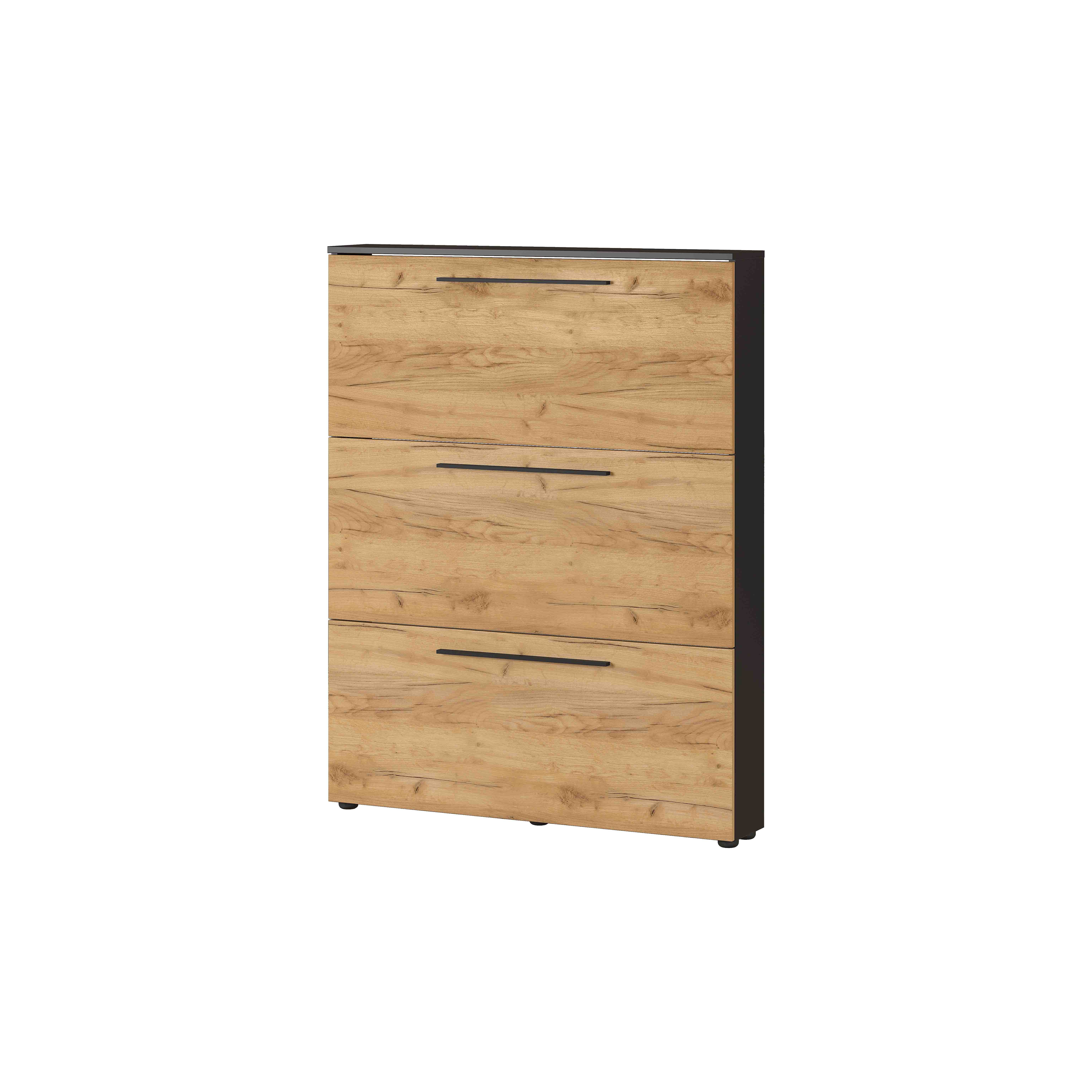 De fronten afgewerkt in Navarra Eiken gecombineerd met de omranding in de kleur grafiet geven deze kast een warme uitstraling. Door zijn minimale diepte van 19 centimeter kun je deze gemakkelijk kwijt. Voldoende ruimte voor ongeveer 12 paar schoenen. Gepoedercoat zwart metalen handvatten in combinatie met geruisloos kleppen maken dit meubelstuk helemaal af. Geproduceerd in Duitsland, dit staat voor degelijke kwaliteit en een lange levensduur. Gemakkelijk te monteren doormiddel van de meegeleverde montagehandleiding.