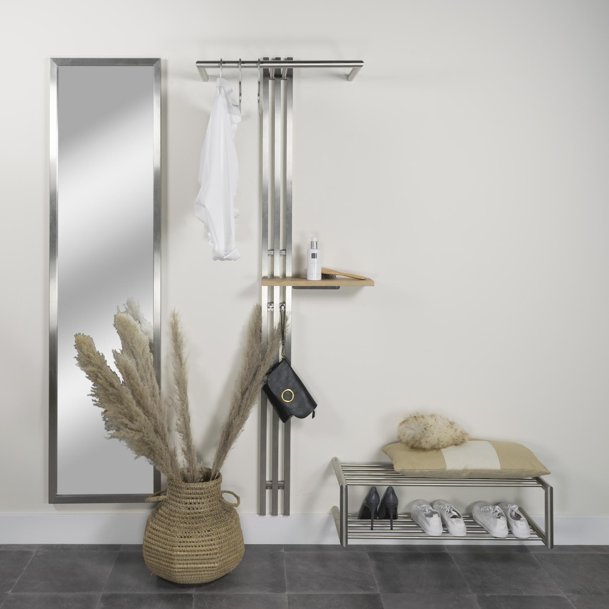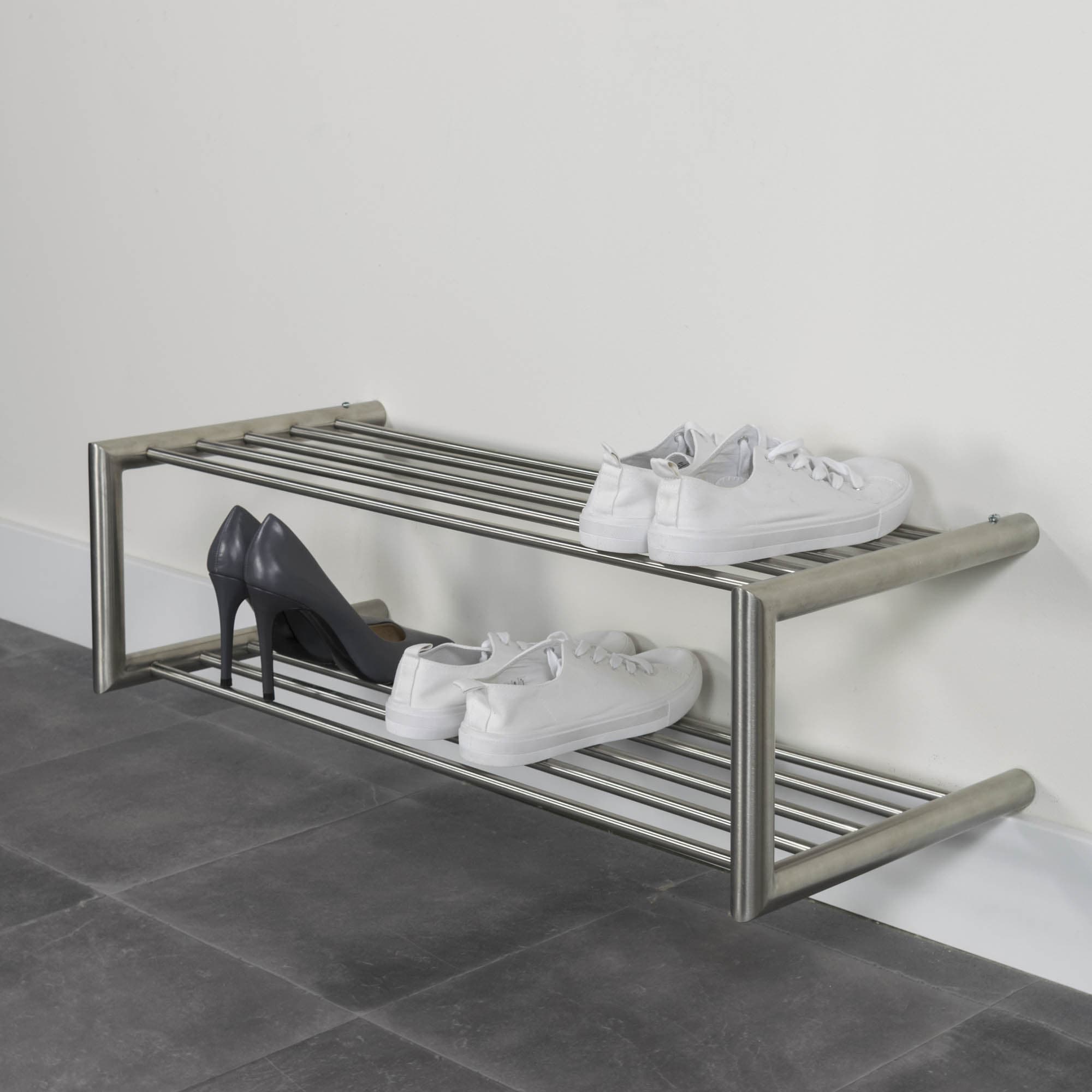 Met dit leuke schoenenrek is een onoverzichtelijke hal verleden tijd. Op dit schoenenrek is ruimte voor ongeveer 6 paar schoenen, het schoenenrek is vervaardigd uit hoogwaardig RVS. Je kunt deze ook aan de muur hangen.