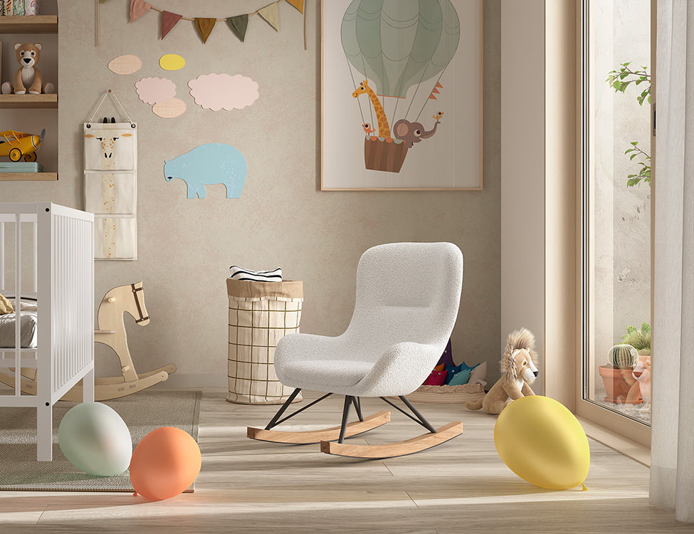 De mini schommelstoel van de -collectie is afgewerkt met een gezellige witte bouclé stof. Deze schattige schommelstoel biedt een knusse zitplaats voor jouw kind waar hij of zij zich comfortabel en geborgen kan voelen. Deze schommelstoel is niet alleen functioneel maar vormt ook een leuke decoratieve toevoeging aan iedere baby- of kinderkamer.