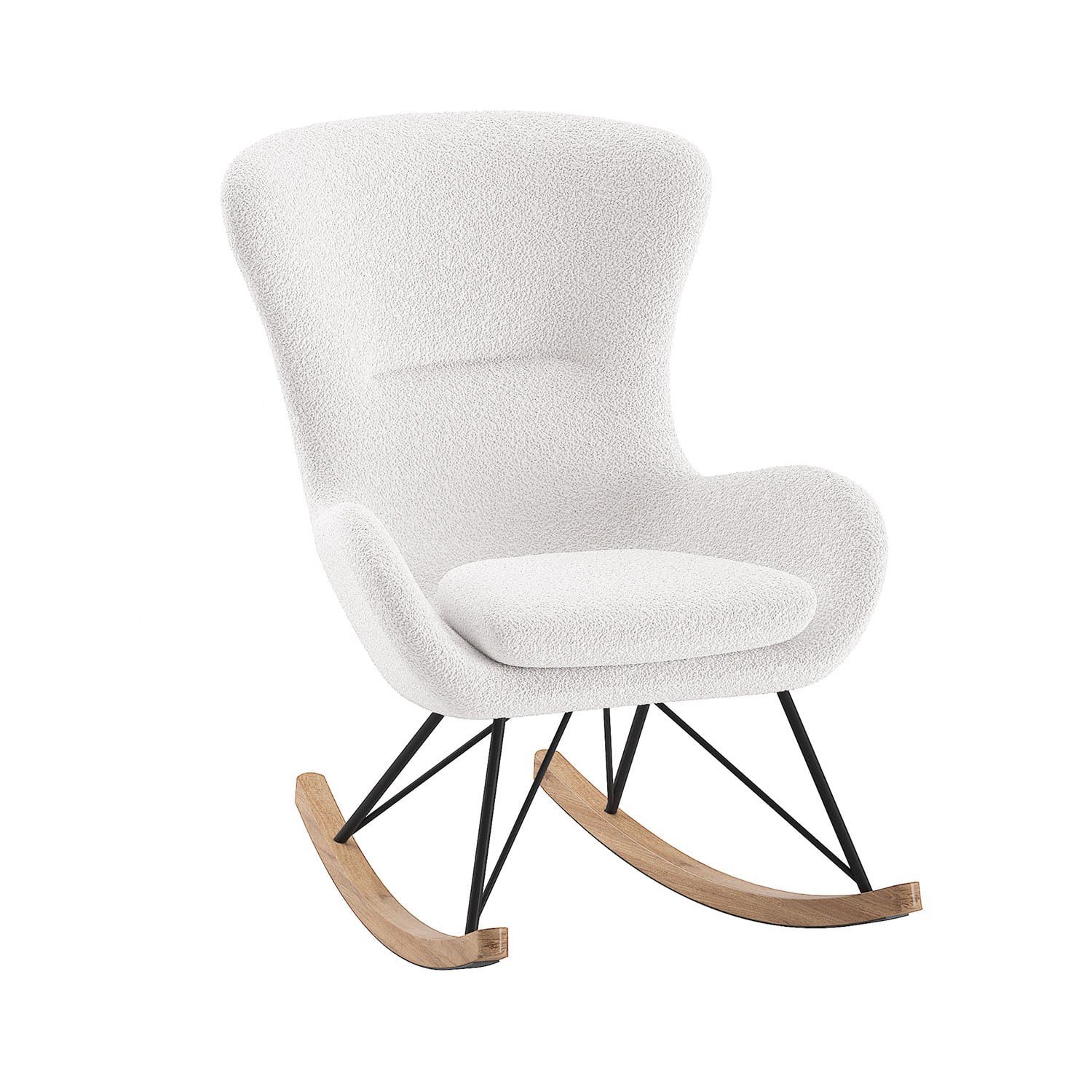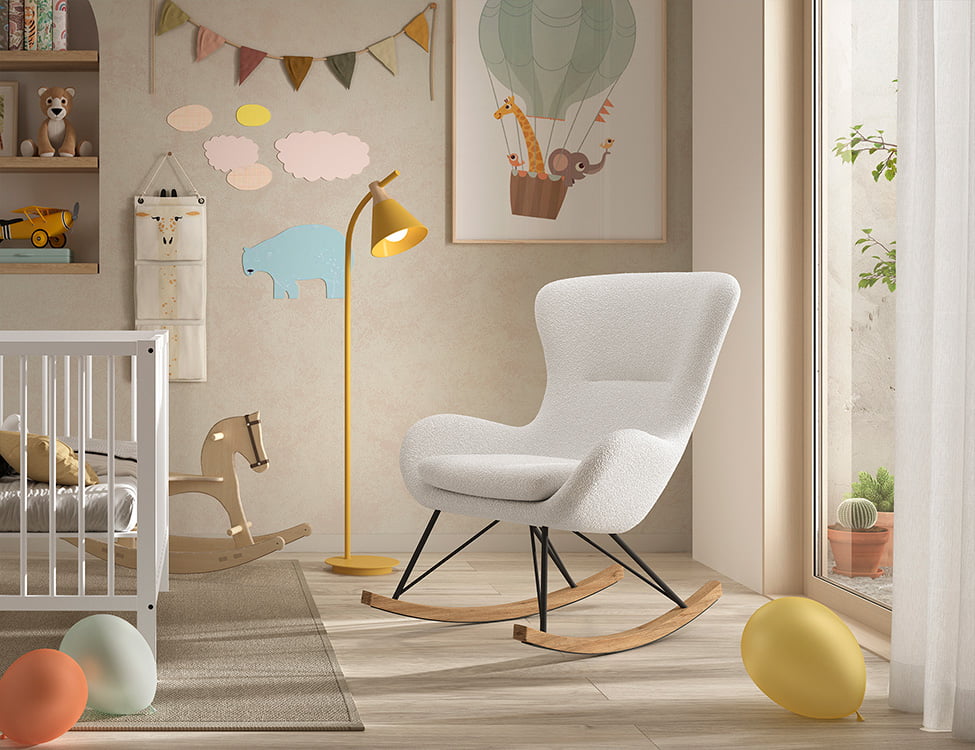 De schommelstoel van de -collectie is afgewerkt met een gezellige witte bouclé stof. De ergonomische vorm van de stoel biedt ondersteuning aan ouders tijdens voedingsmomenten of gewoon om samen te ontspannen in de babykamer. Deze schommelstoel is de perfecte keuze voor ouders die streven naar een gezellige en trendy omgeving voor hun kleintje.