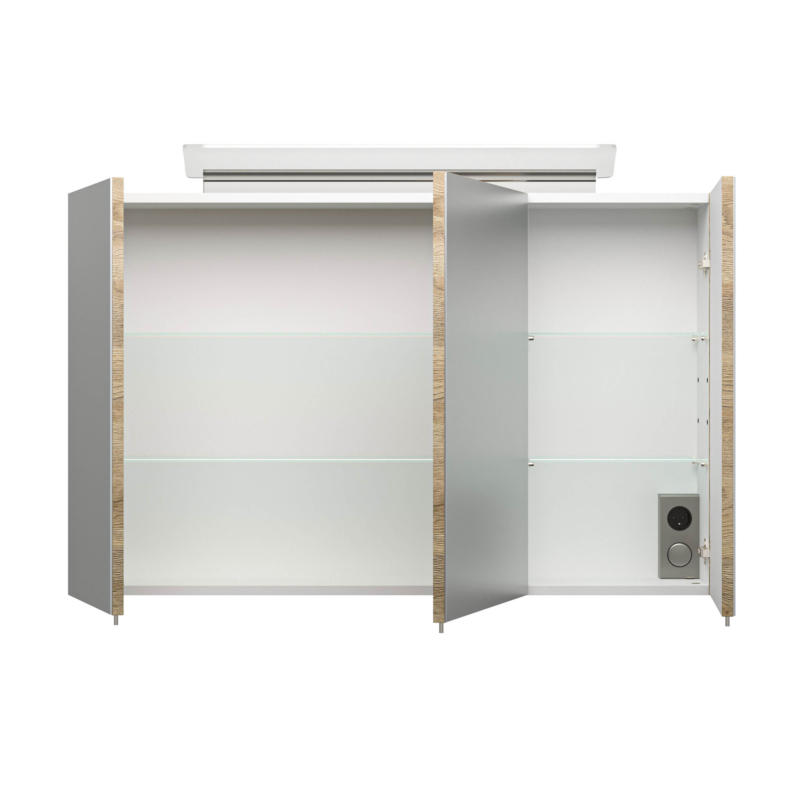 Deze spiegelkast kan door zijn strakke design een plaatsje vinden in elke badkamer. Door zijn 13 watt neutraal witte lamp ben je verzekerd van goed licht! (4000 Kelvin). Achter de deuren, voorzien van soft-close, bevinden zich 4 glazen planken om al je spullen op te bergen, ook bevindt zich hier de aan/uit knop in combinatie met een stopcontact. Deze kast is afgewerkt met een eiken melamine en is 100cm breed, 62cm hoog en 17cm diep.