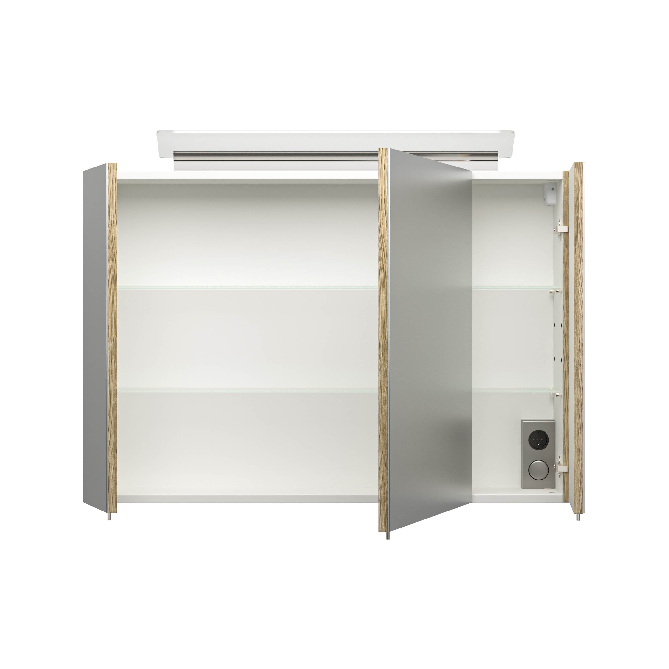 Deze spiegelkast kan door zijn strakke design een plaatsje vinden in elke badkamer. Door zijn 10 watt neutraal witte lamp ben je verzekerd van goed licht! (4000 Kelvin). Achter de deuren, voorzien van soft-close, bevinden zich 4 glazen planken om al je spullen op te bergen, ook bevindt zich hier de aan/uit knop in combinatie met een stopcontact. Deze kast is afgewerkt met een eiken melamine en is 90cm breed, 62cm hoog en 17cm diep.