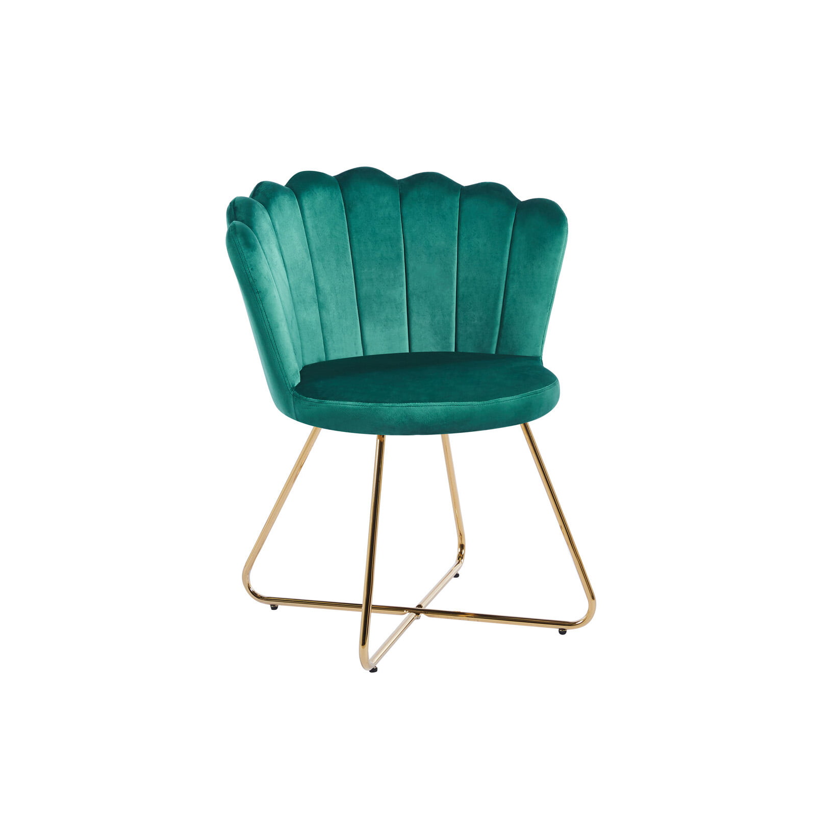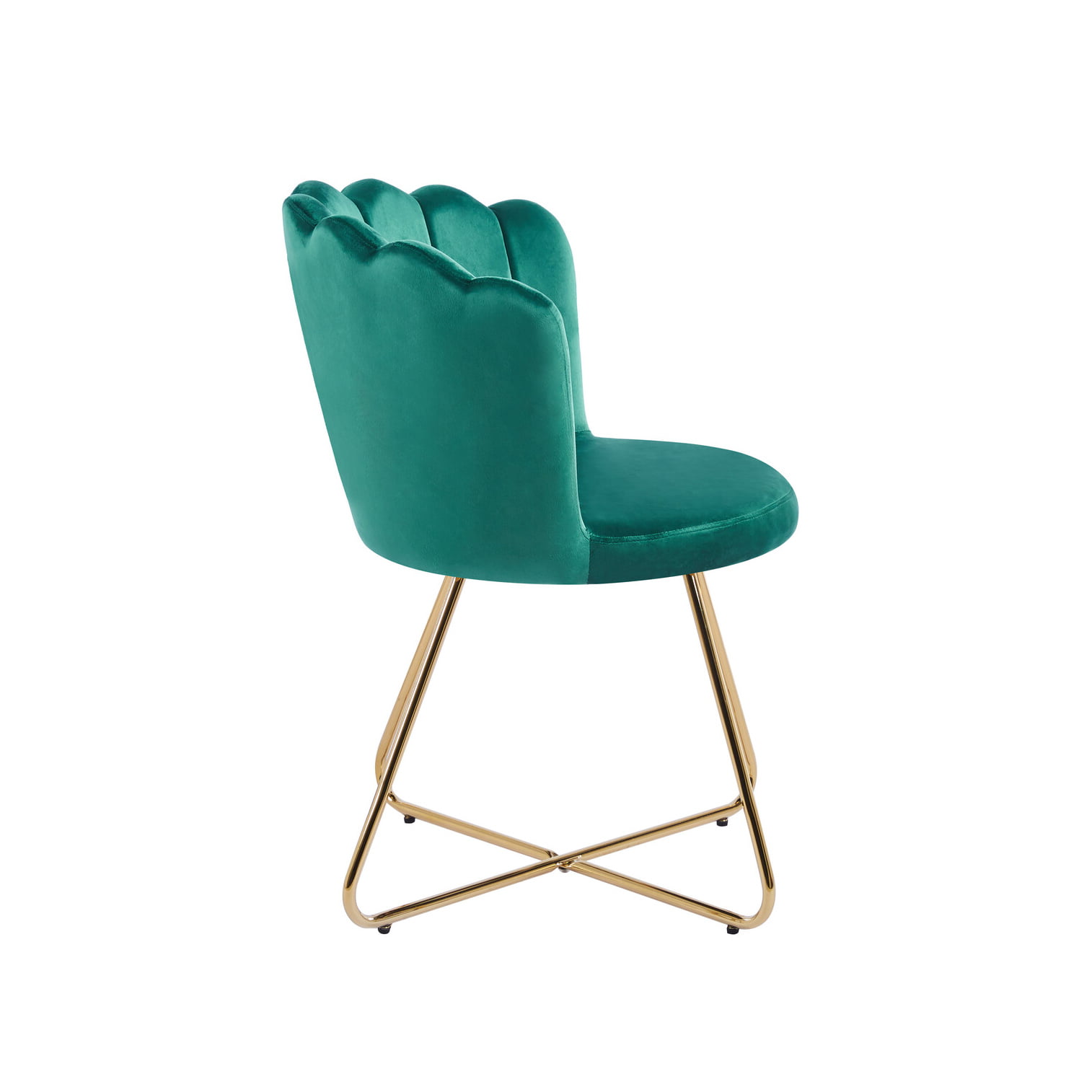 Ontsnap aan het alledaagse met de Stoel Chanelle Groen, geleverd in een set van 2. De moderne schelpvorm, fluwelen bekleding en het gekruiste designframe van verguld metaal maken deze stoelen tot een stijlvolle toevoeging aan je interieur.