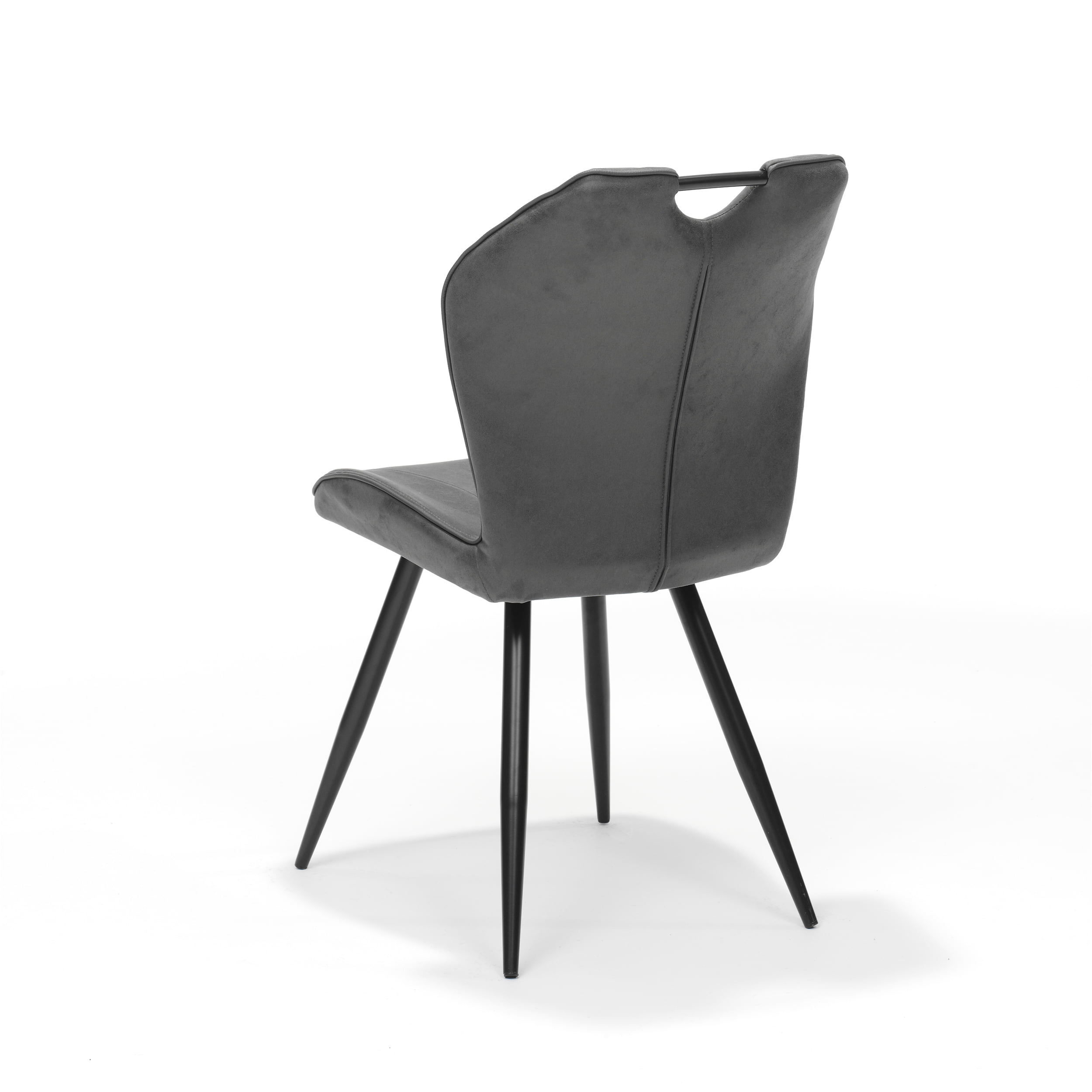 Stoel Floris is een vintage retro stoel met zwart metalen onderstel en gestoffeerde luxe zitting. De rugleuning is netjes gestikt en heeft als detail een handig handvat om de stoel aan te kunnen schuiven aan tafel. De stoel heeft een zithoogte van 50 cm en een zitdiepte van 43 cm. Stoel Floris is verkrijgbaar in de kleuren Antraciet, Groen en Cognac en uitsluitend per vier stuks te bestellen.