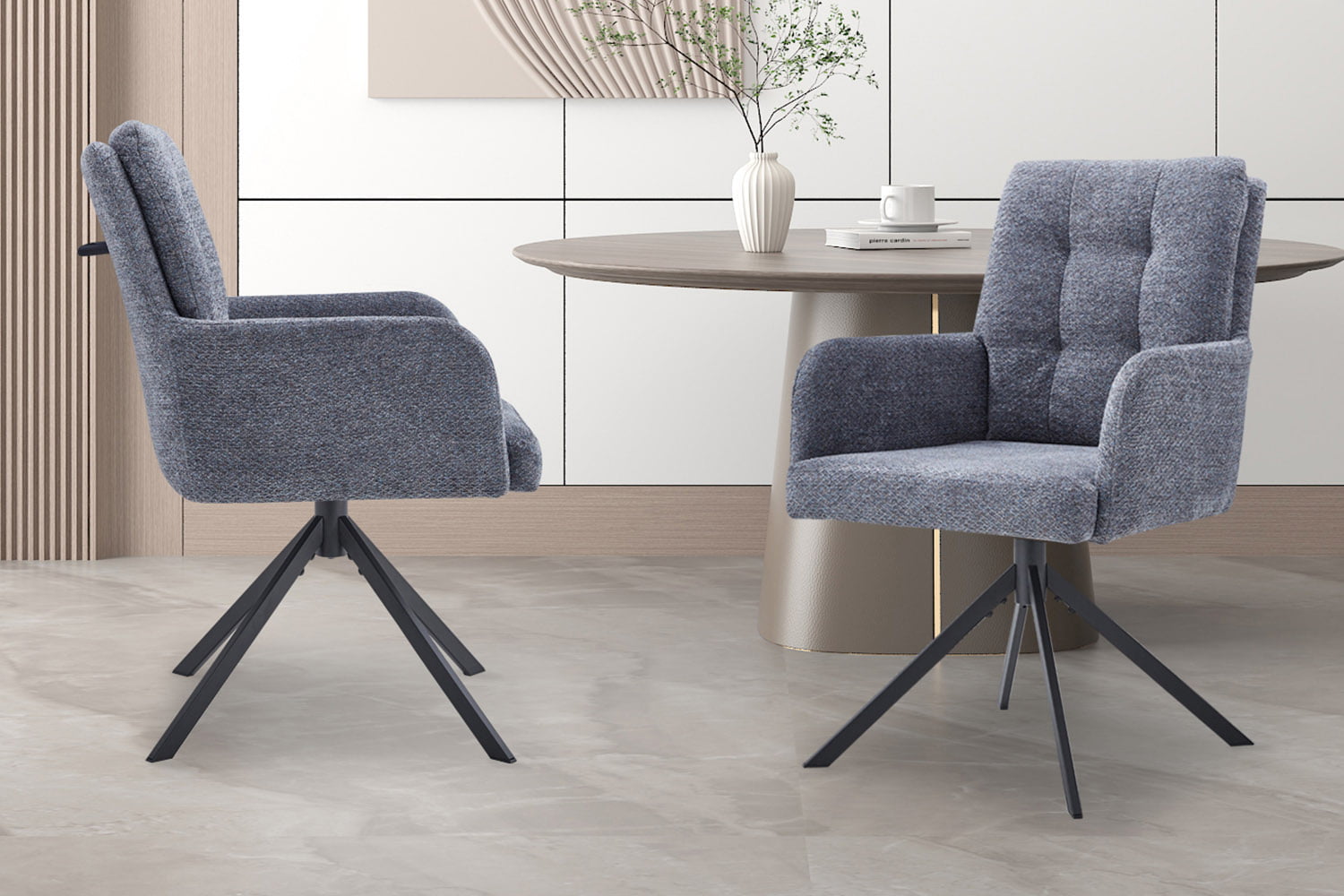 De stoelen zijn voorzien van stevige metalen poten die stabiliteit en duurzaamheid garanderen. De bekleding van donkergrijze stof voegt een vleugje luxe toe aan je eetruimte en biedt tegelijkertijd een comfortabele zitplaats tijdens lange diners of gezellige bijeenkomsten.