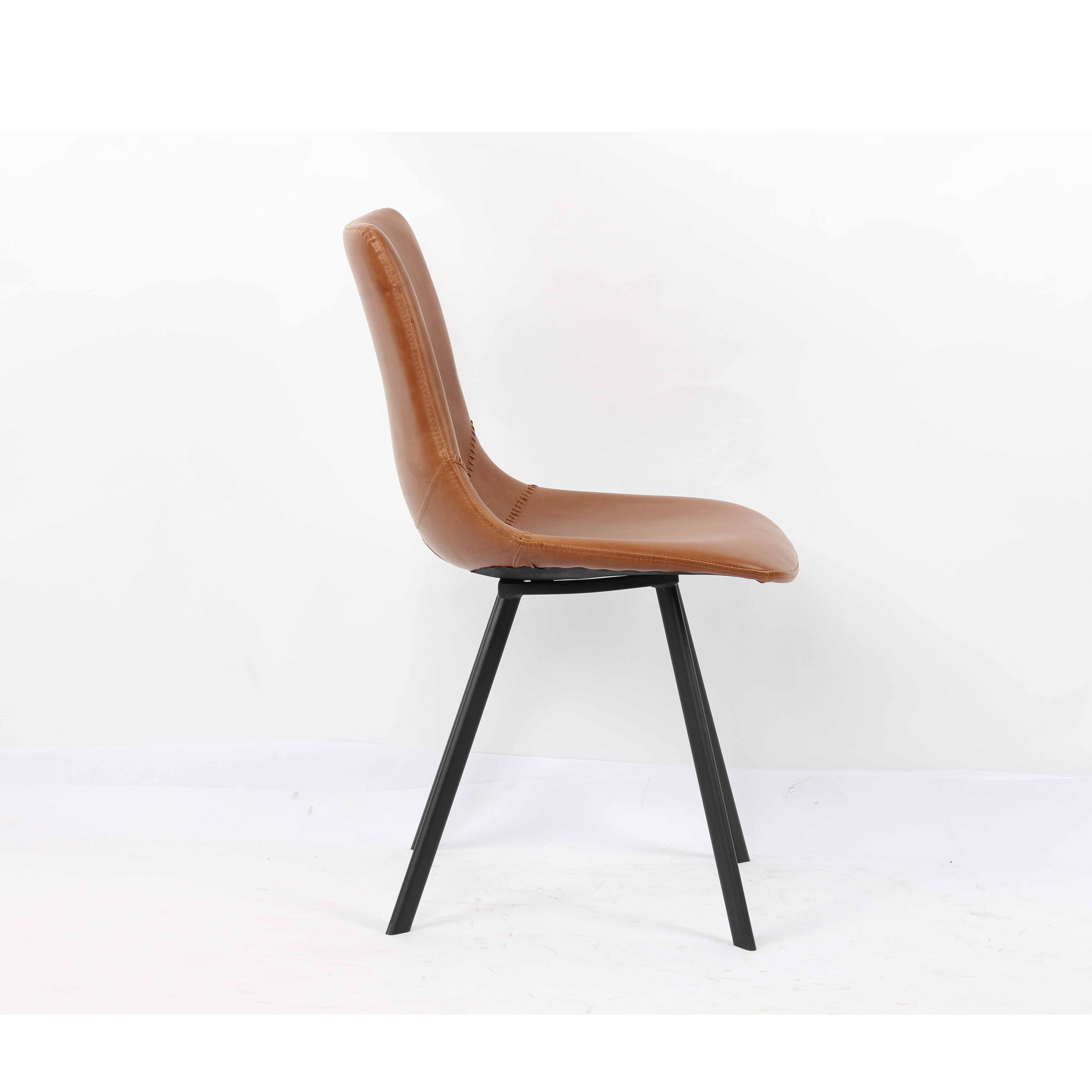 Door zijn voorgevormde kuip biedt deze stoel een goed zitcomfort, in combinatie met zijn strakke metalen poten en kunstleren bekleding geeft deze stoel een robuuste uitstraling. Hij heeft een zithoogte van 44 cm, een zitdiepte van 42 cm en is verkrijgbaar in het bruin, zwart, grijs en cognac. Deze stoel is door zijn rustige kleuren ook goed te combineren.