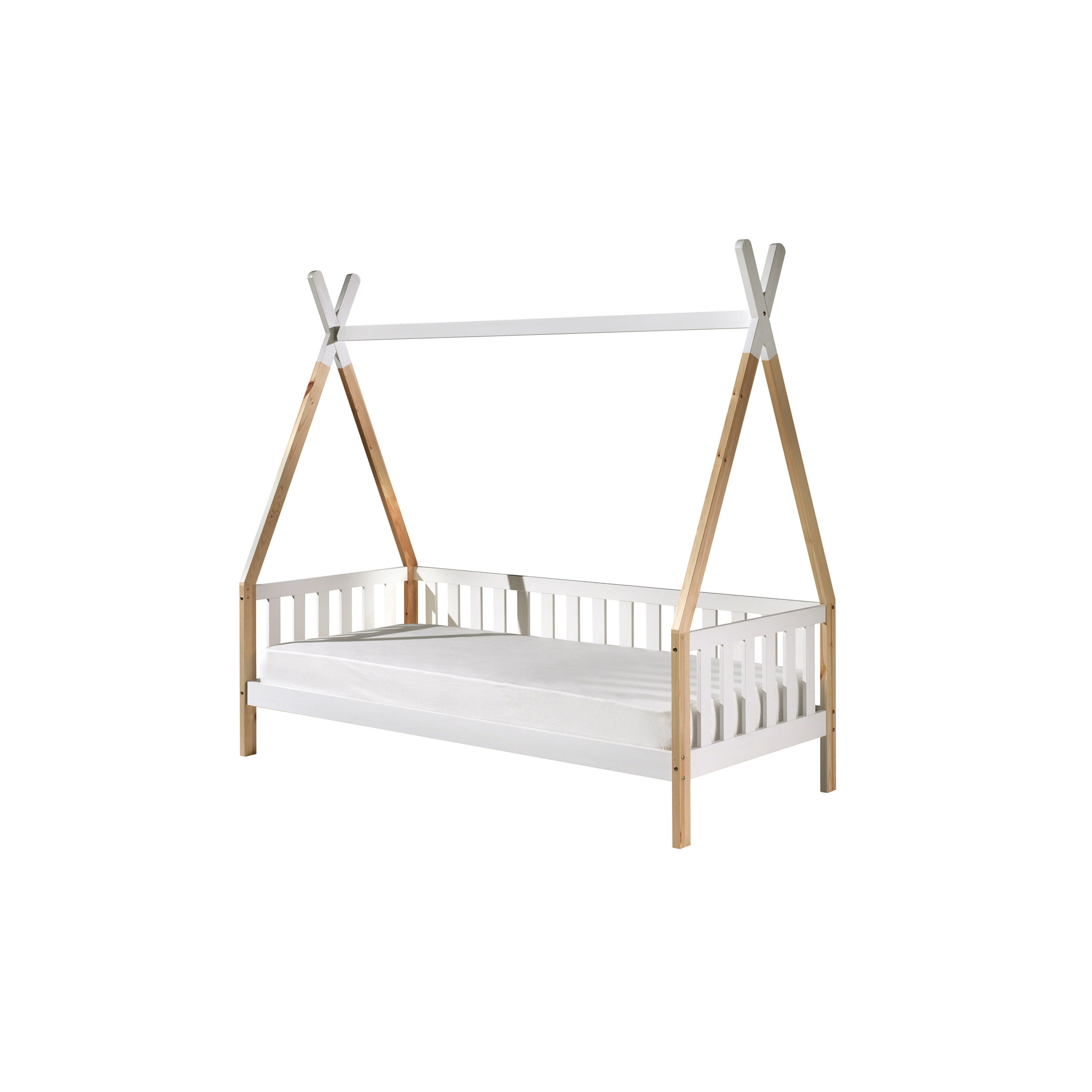 Met dit prachtige tipibed is je kind helemaal gelukkig! Door het bed omgekeerd tegen de muur te zetten ben je in het begin direct van een uitvalbeveiliging voorzien. Door het bed te versieren met kleurrijke kussens, dekentjes en andere attributen maak je het al gauw gezellig. Het bed is vervaardigd uit Scandinavisch grenen en afgewerkt met een sterke lak. Het bed wordt geleverd inclusief lattenbodem. Maximaal toelaatbare gewicht per slaapplaats is 75KG. Onder het bed voldoende opbergruimte voor speelgoed of voor het plaatsen van een rolbed. Gemakkelijk te monteren door middel van bijgeleverde montagehandleiding.