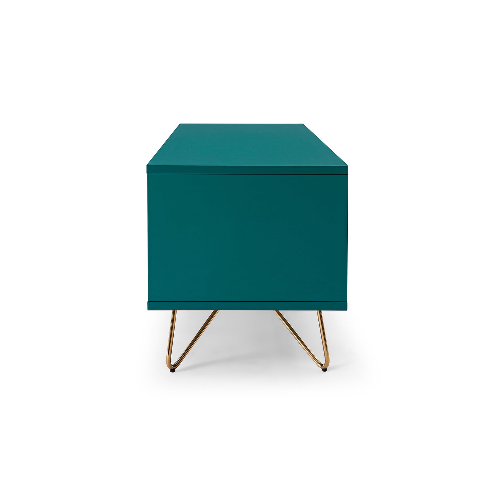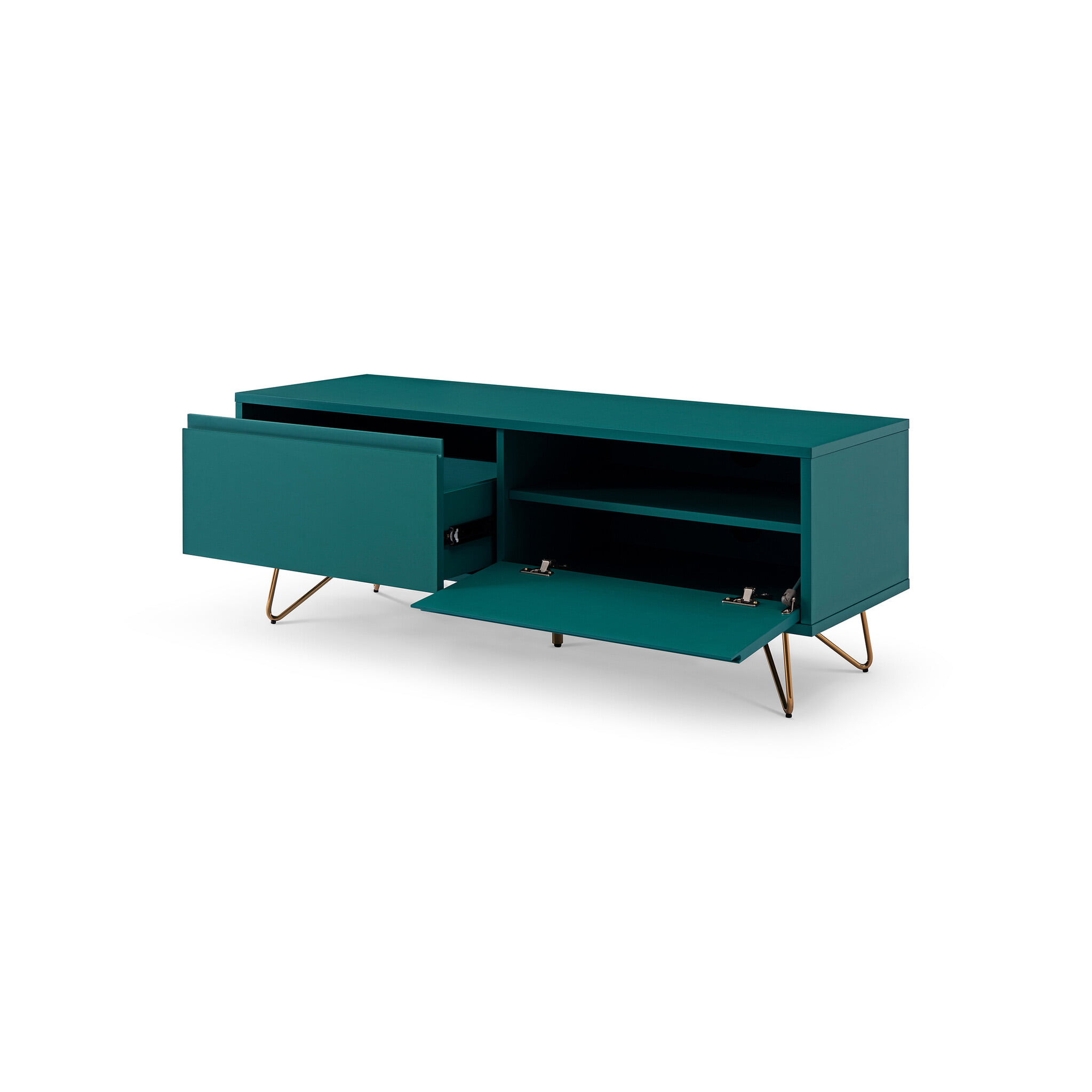 Dit stijlvolle tv-meubel biedt voldoende ruimte voor al je spullen achter de deur en klep, de legplank achter de klep is verwijderbaar. Het tv-meubel is vervaardigd uit een stevige MDF en heeft een matte afwerking. Door de combinatie met zijn gouden metalen poten een echte eyecatcher in je interieur. Gemakkelijk te monteren doormiddel van bijgeleverde montagehandleiding. Bekijk ook de andere elementen uit deze serie.