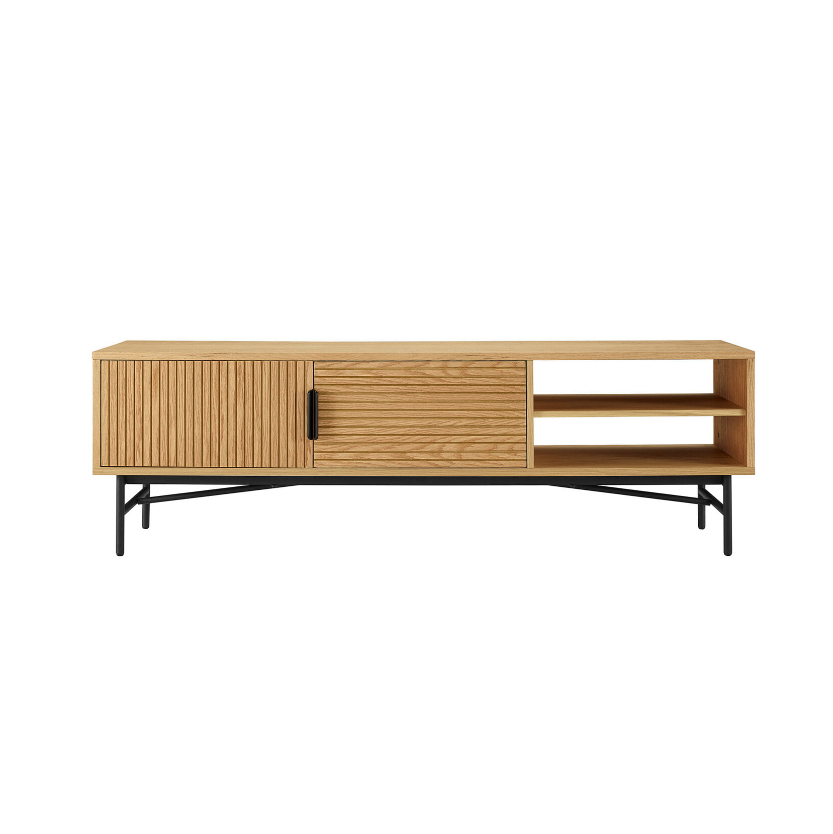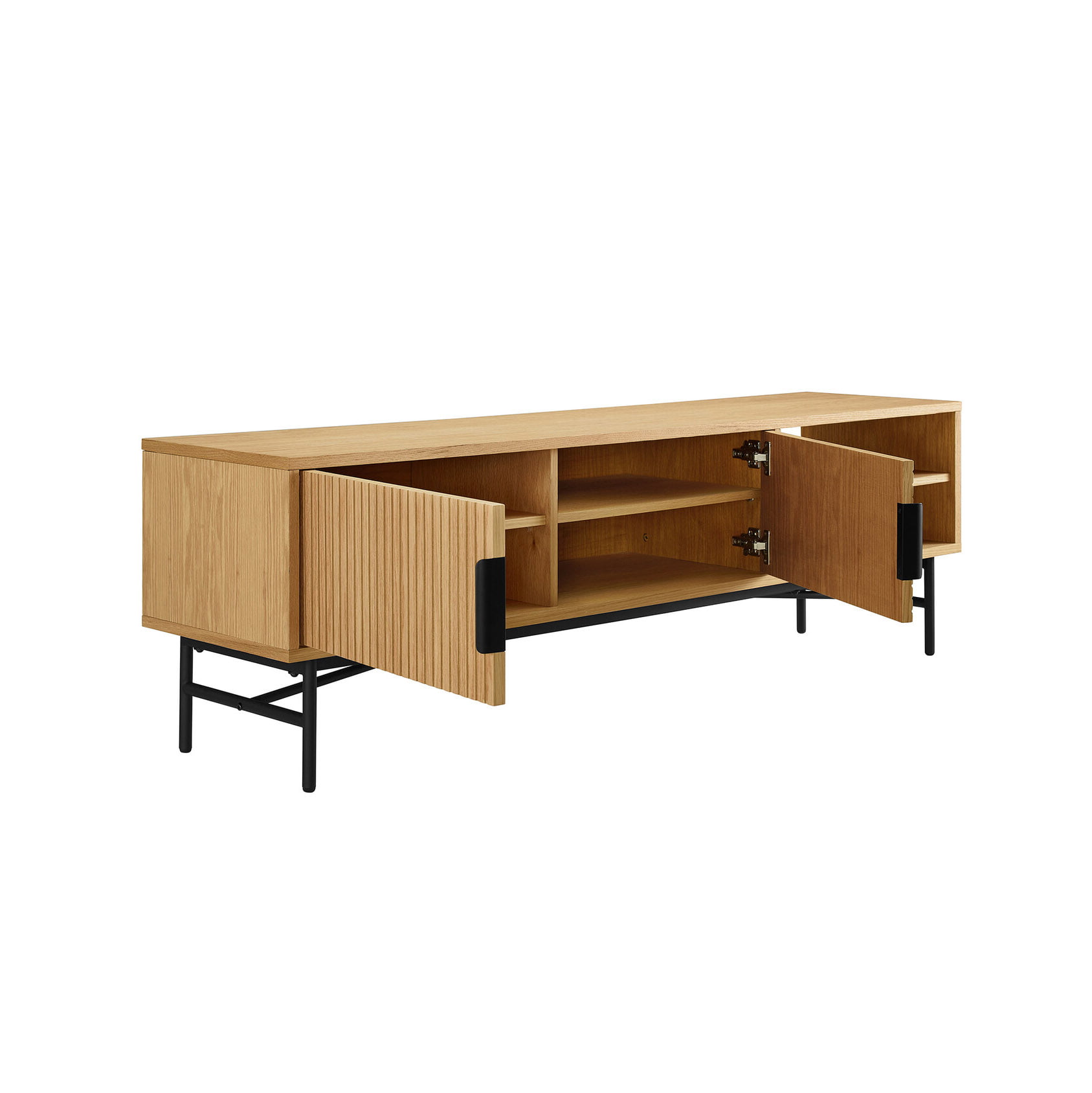 De deuren van dit degelijke tv-meubel zijn voorzien van soft-close waardoor deze geruisloos sluiten. Achter elke deur bevindt zich 1 verstelbare legplank. Dit meubel is vervaardigd uit een combinatie van gefineerd eiken MDF en melamine. Het zwarte gepoedercoate metalen frame maakt dat dit meubel stevig staat. Gemakkelijk te monteren door middel van bijgeleverde montagehandleiding. Leuk te combineren met de andere artikelen uit deze serie!