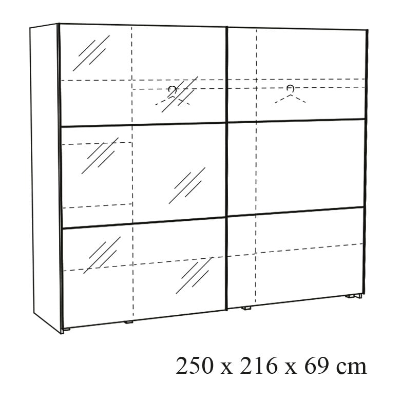 Deze riante tweedeursschuifdeurkast heeft bovenin achter de deuren een legplank en daaronder hangt een kledingroede. Achter de linkerdeur zijn links nog 4 kleine legplanken en links onderin 1 legplank. Achter de rechter deur zijn bovenin een legplank met daaronder een roede. Onderin is nog een brede legplnak. Zie ook de teking van de kast met indeling bij de foto’s.. Op de deuren is een decoratieve maar ook praktische spiegel. Totale breedte 250 cm.