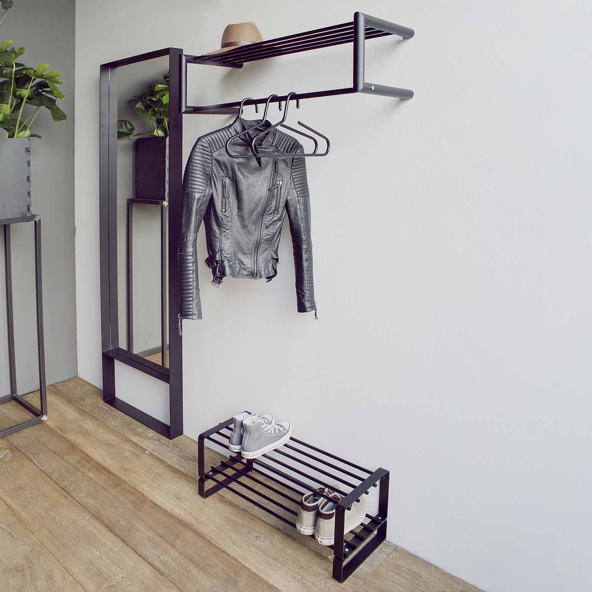 Moderne handige kapstok met voldoende ruimte voor kledinghangers. Bovenop ruimte voor diverse overige kledingstukken. Afgewerkt in een degelijke zwarte epoxy-lak.