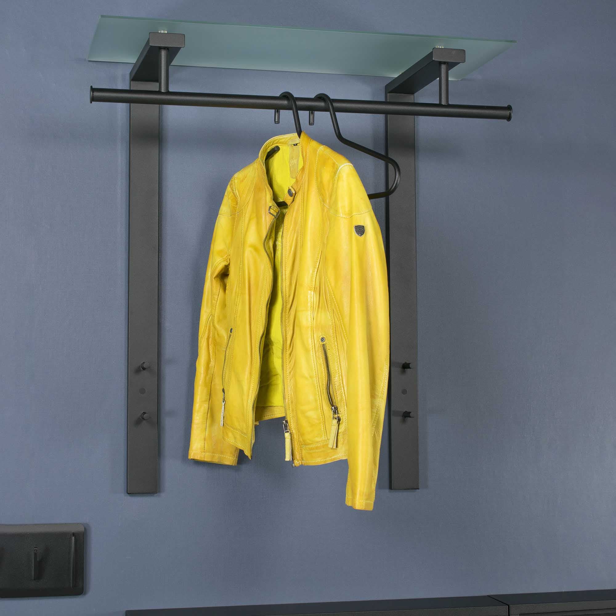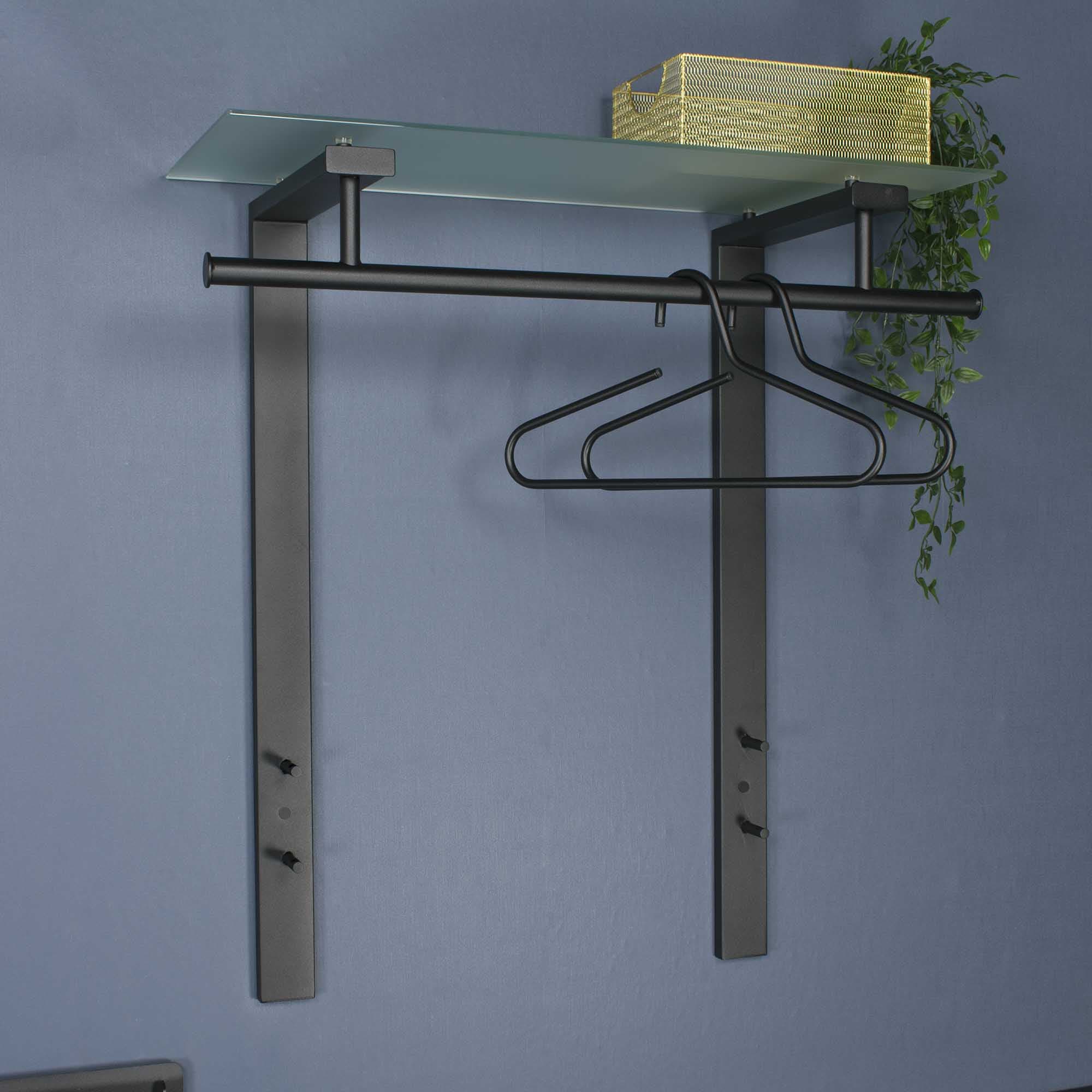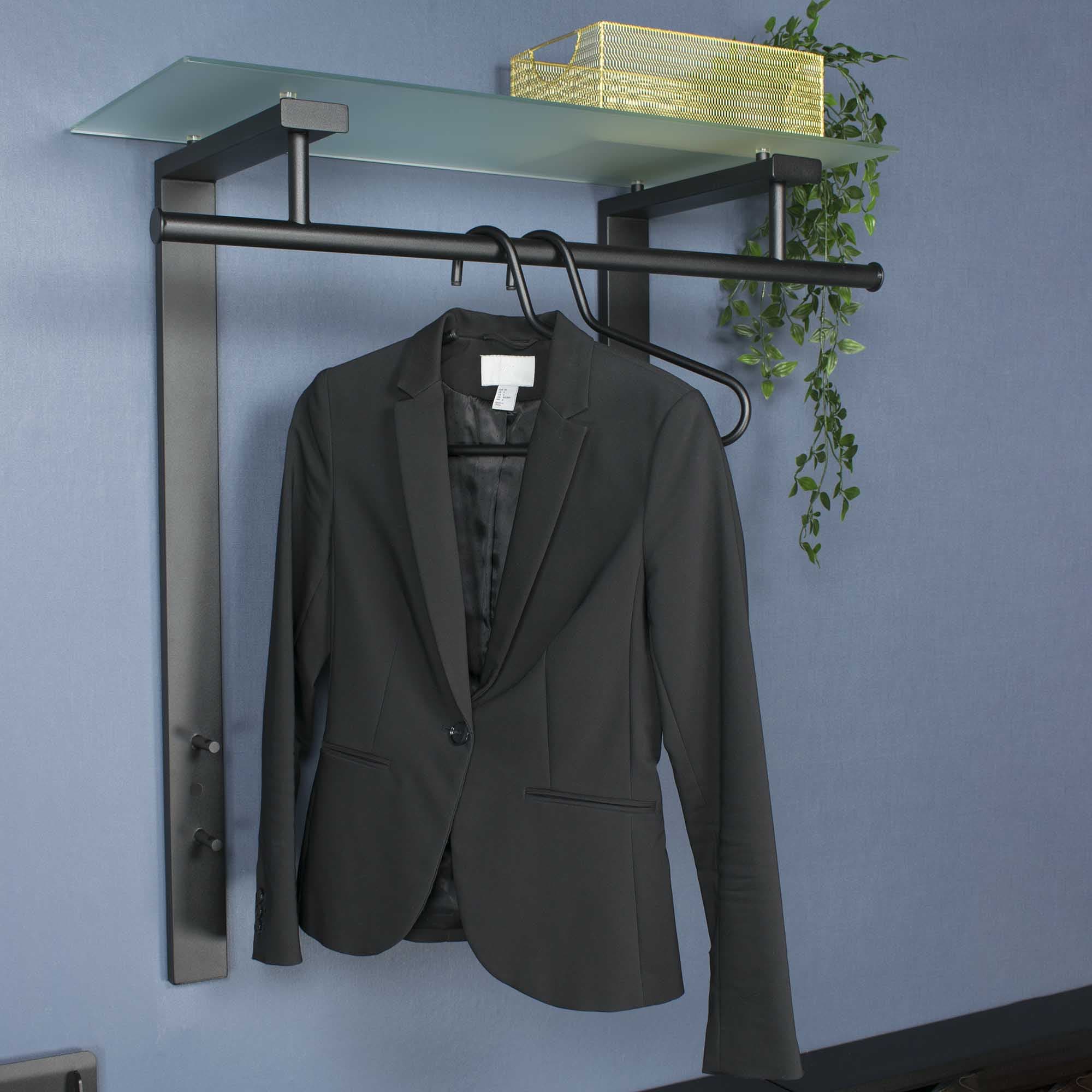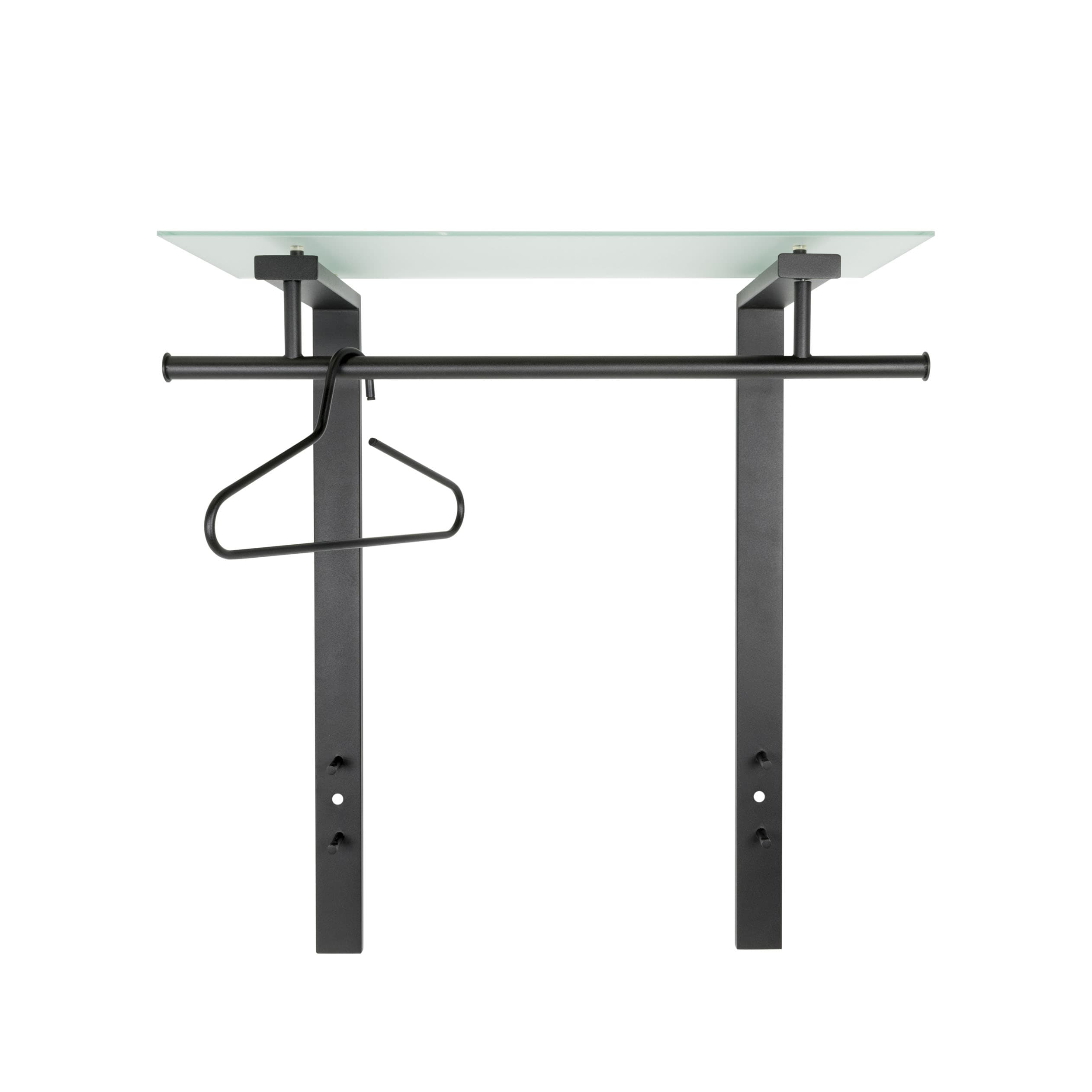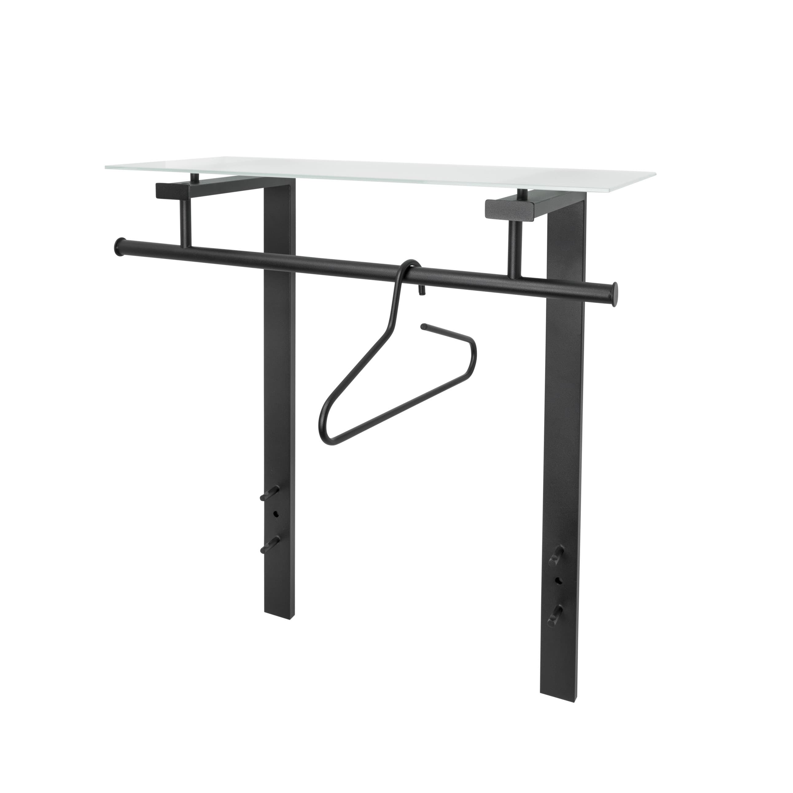 Moderne handige kapstok met bovenaan ruimte voor de kledinghaken. Bovenop een melkglazen blad met ruimte voor diverse kledingstukken. Exclusief de afgebeelde kledinghanger.