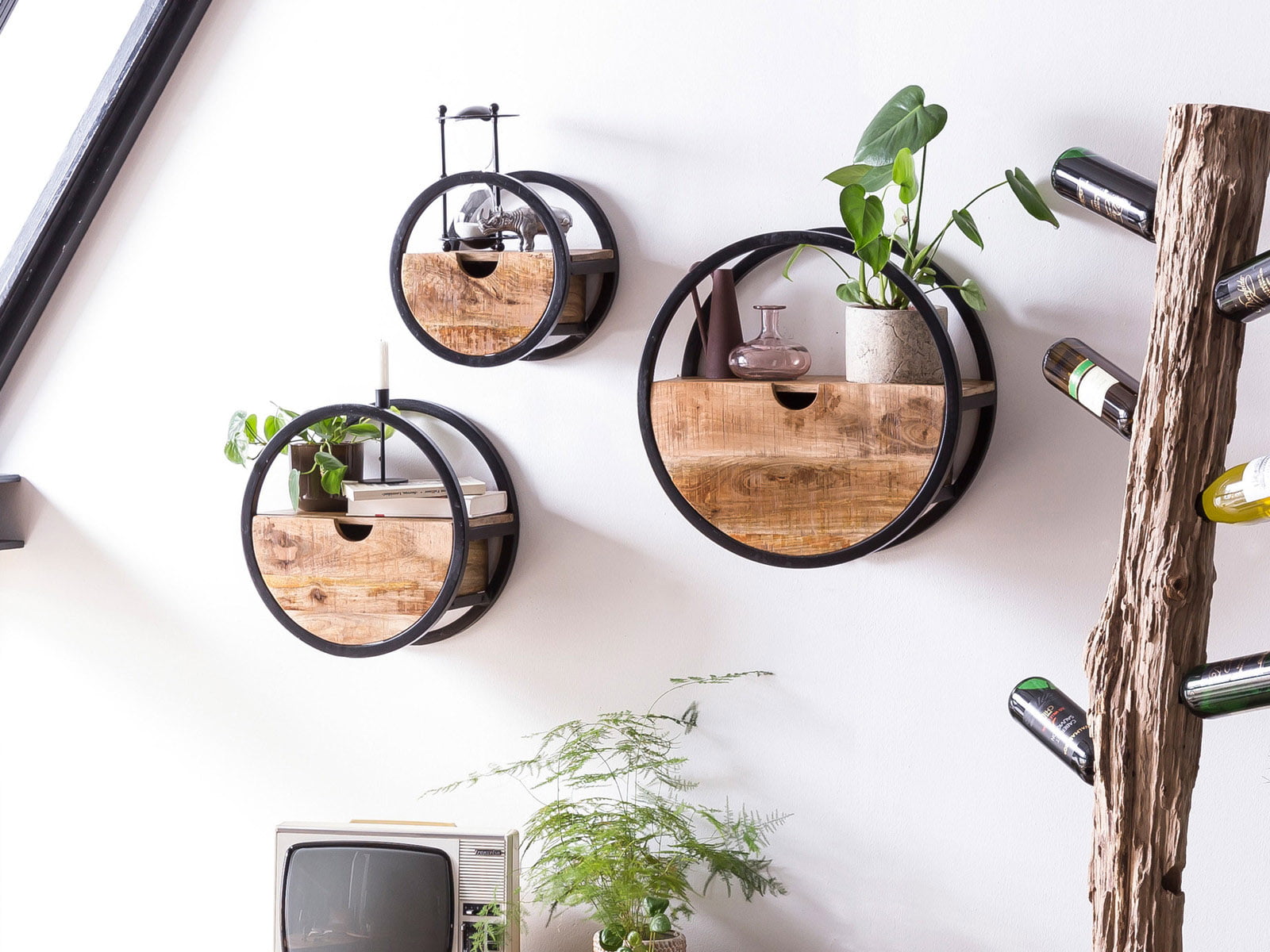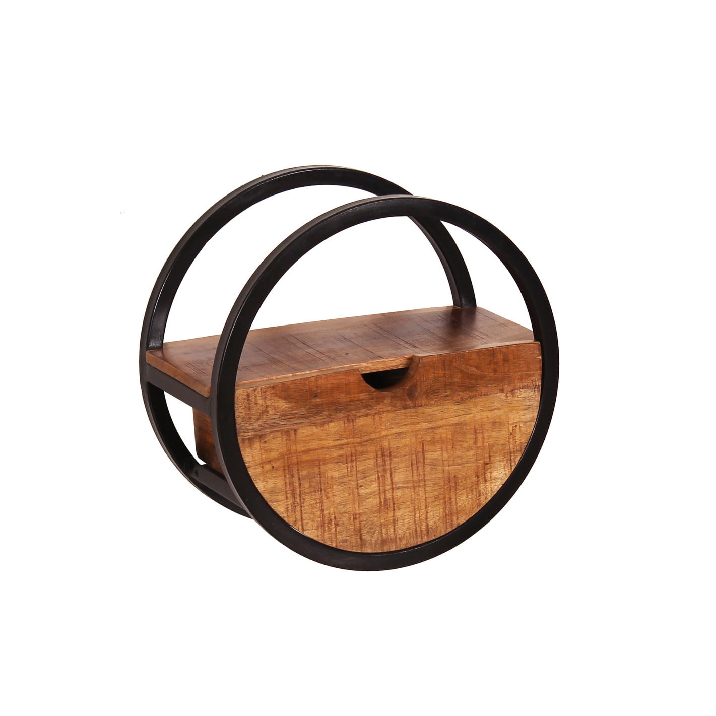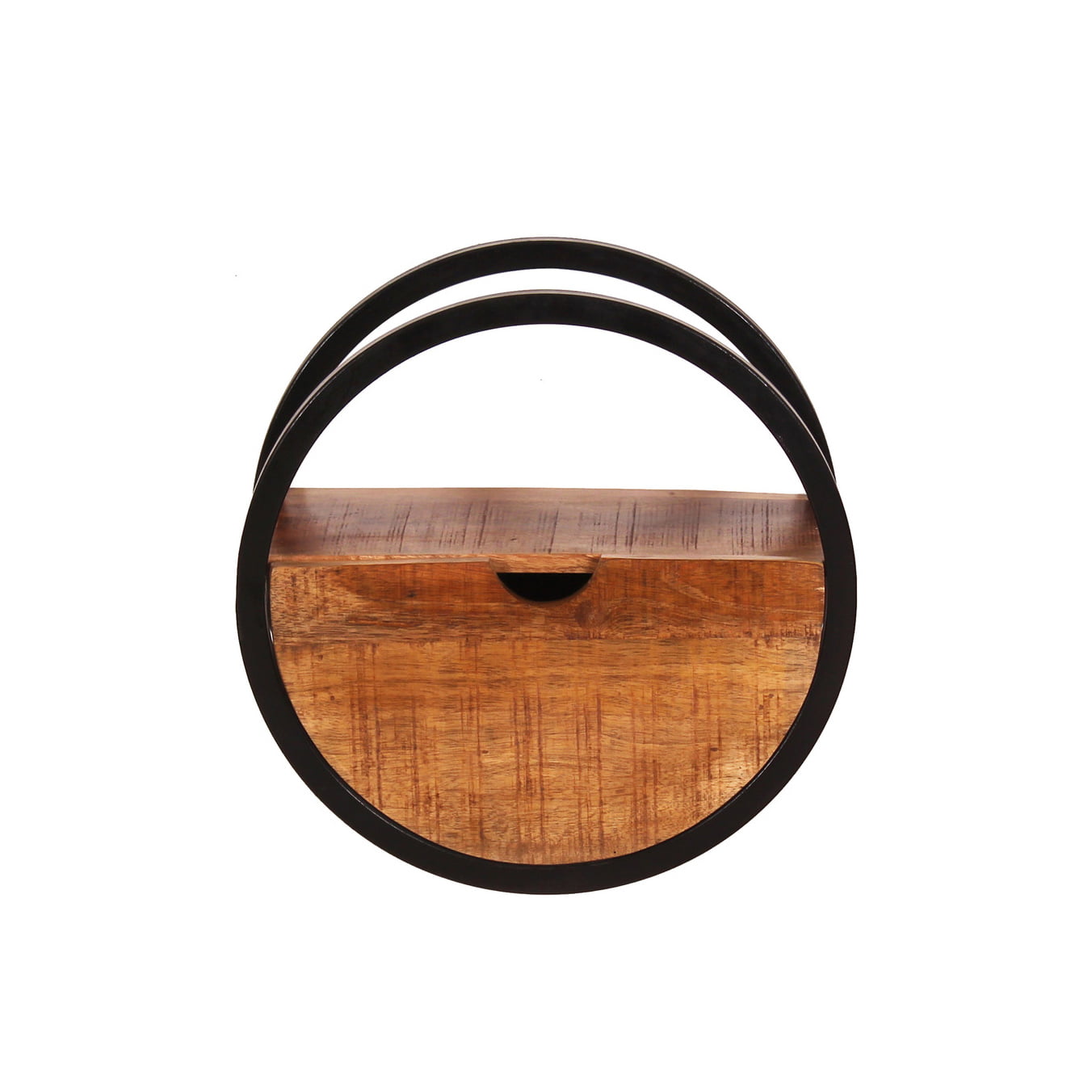 Dit compacte ronde wandrek combineert een praktische lade met een open plank. Het robuuste mango hout en metalen frame zorgen voor een stoere uitstraling.