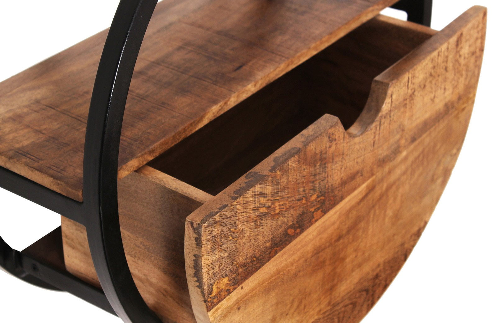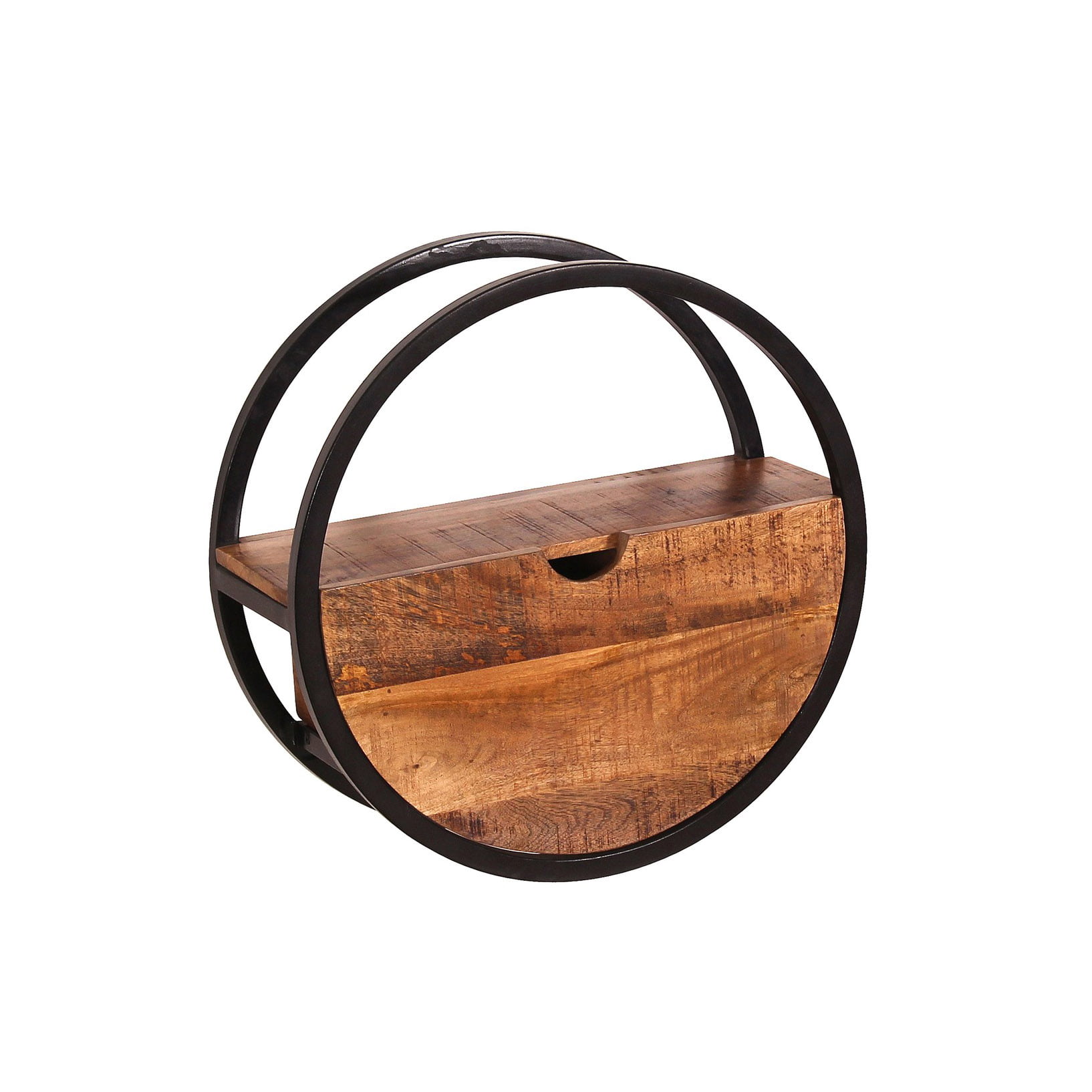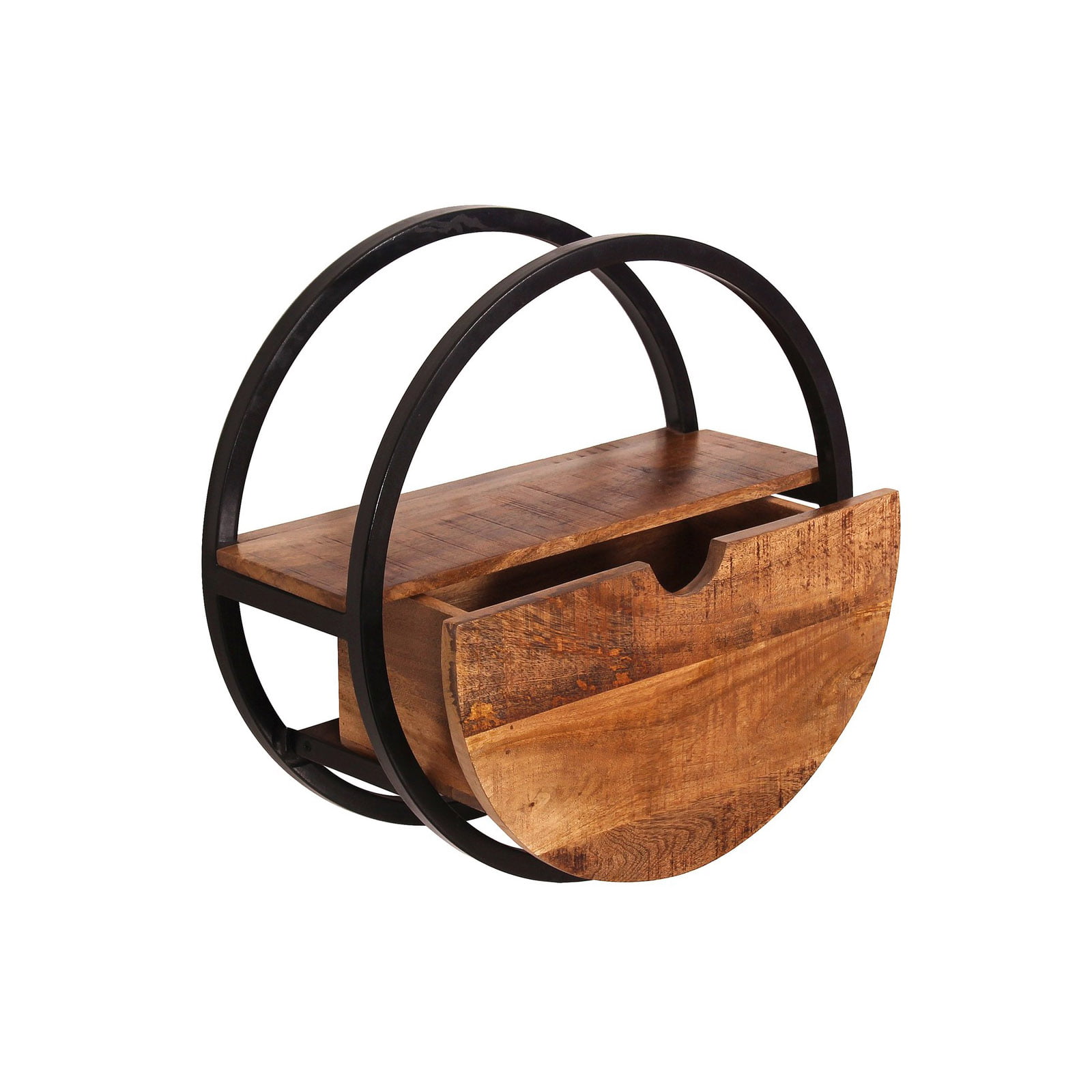 Een stijlvol, rond wandrek met een lade voor extra opbergruimte. De combinatie van natuurlijk mango hout en een zwart metalen frame geeft een moderne industriële uitstraling.