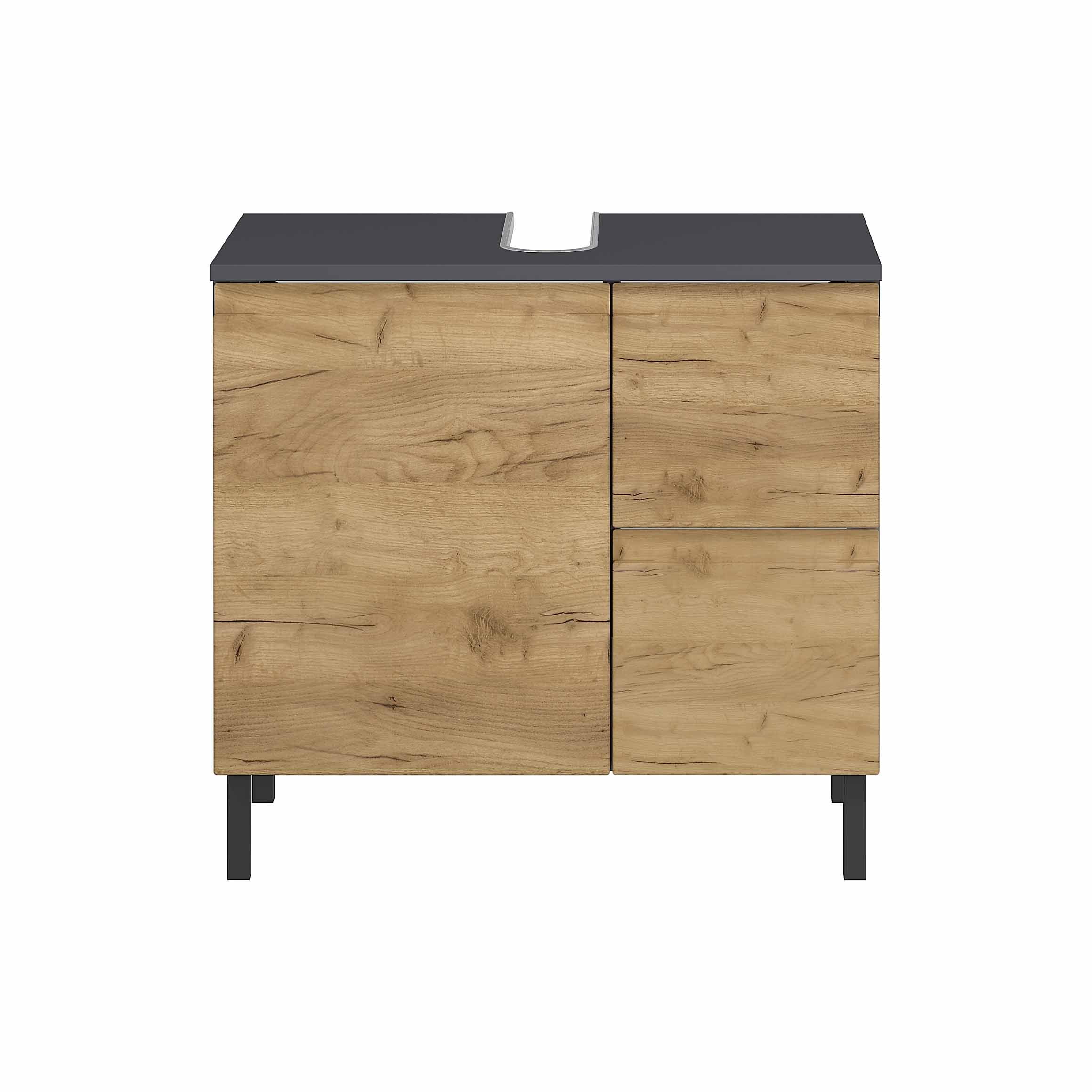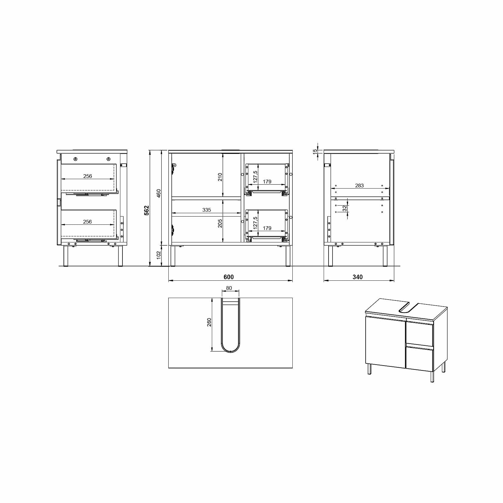 Deze ideale wastafelkast voorziet je in voldoende opbergruimte. Achter de linker deur bevindt zich een verstelbare legplank, aan de rechterkant van het meubel 2 laden. Deze sluiten allen zacht en geruisloos door het soft-close systeem. Gepoedercoat metalen pootjes in combinatie met geruisloos sluitende deuren en laden maken dit meubelstuk helemaal af. Geproduceerd in Duitsland, dit staat voor degelijke kwaliteit en een lange levensduur. Gemakkelijk te monteren doormiddel van de meegeleverde montagehandleiding. Bekijk ook de andere elementen uit deze badkamerserie!