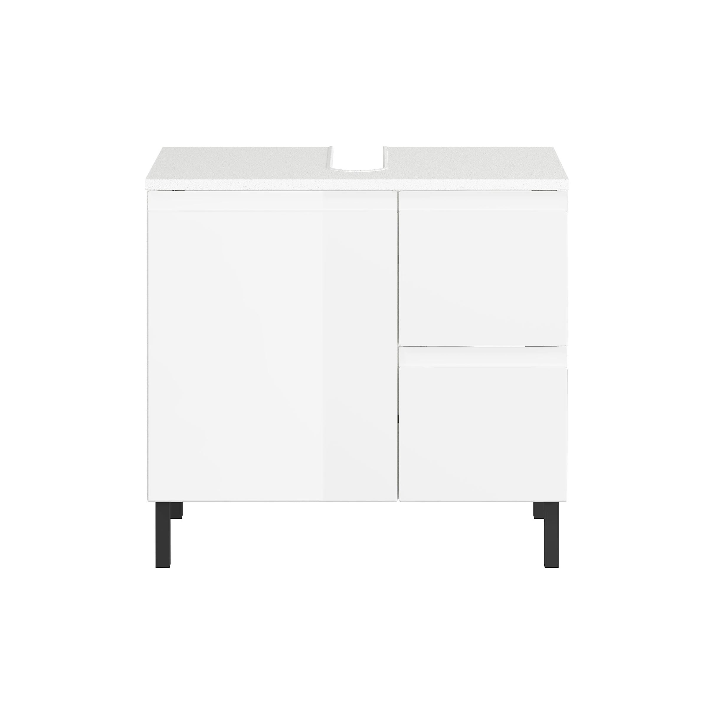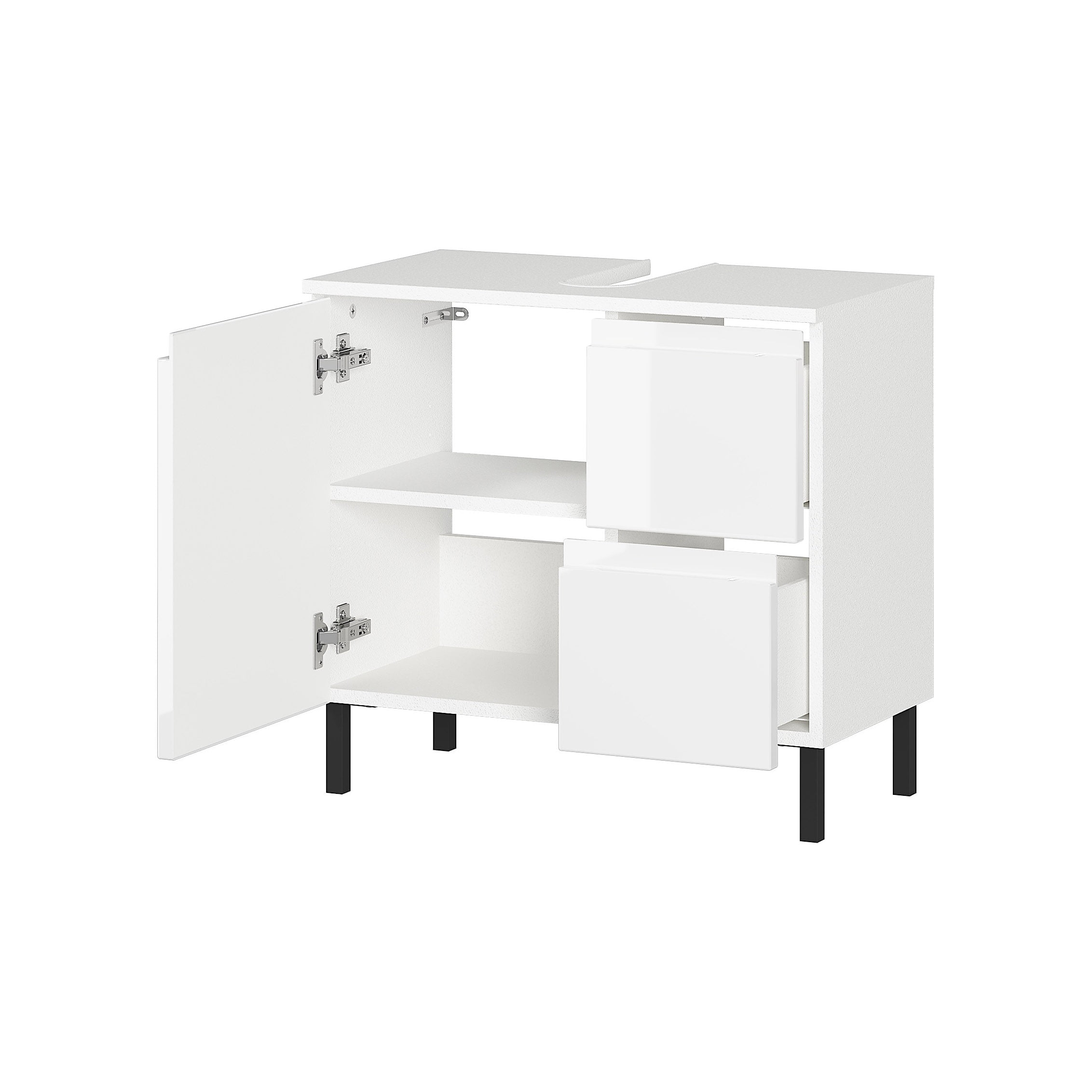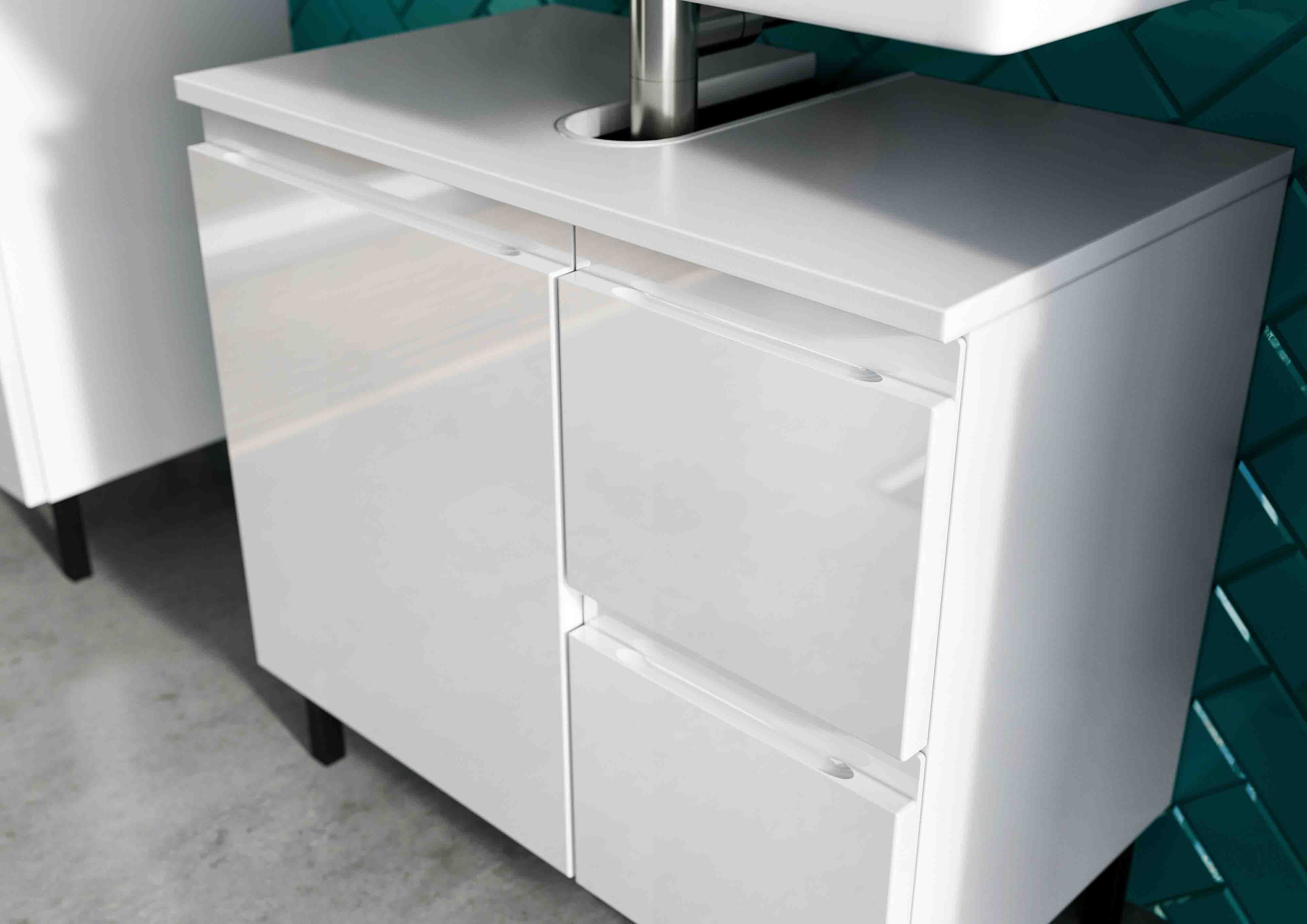 Deze ideale wastafelkast voorziet je in voldoende opbergruimte. Achter de linker deur bevindt zich een verstelbare legplank, aan de rechterkant van het meubel 2 laden. Deze sluiten allen zacht en geruisloos door het soft-close systeem. Gepoedercoat metalen pootjes in combinatie met geruisloos sluitende deuren en laden maken dit meubelstuk helemaal af. Geproduceerd in Duitsland, dit staat voor degelijke kwaliteit en een lange levensduur. Gemakkelijk te monteren doormiddel van de meegeleverde montagehandleiding. Bekijk ook de andere elementen uit deze badkamerserie!