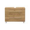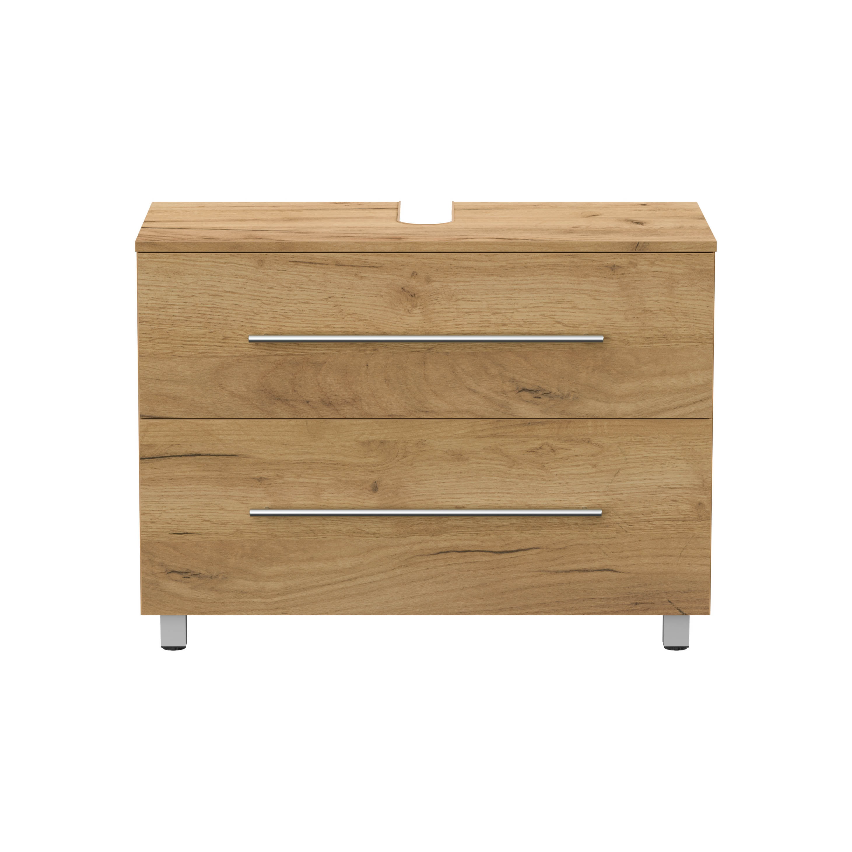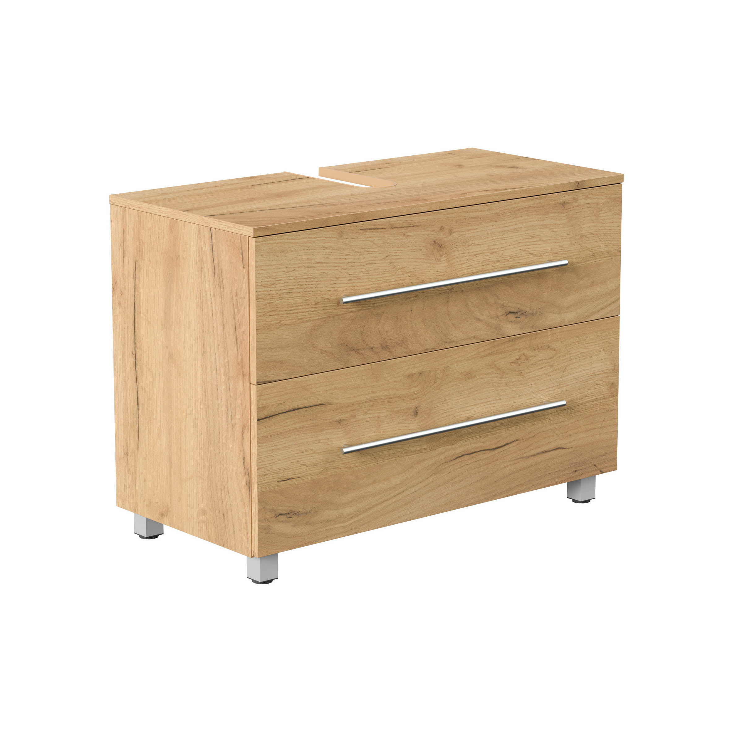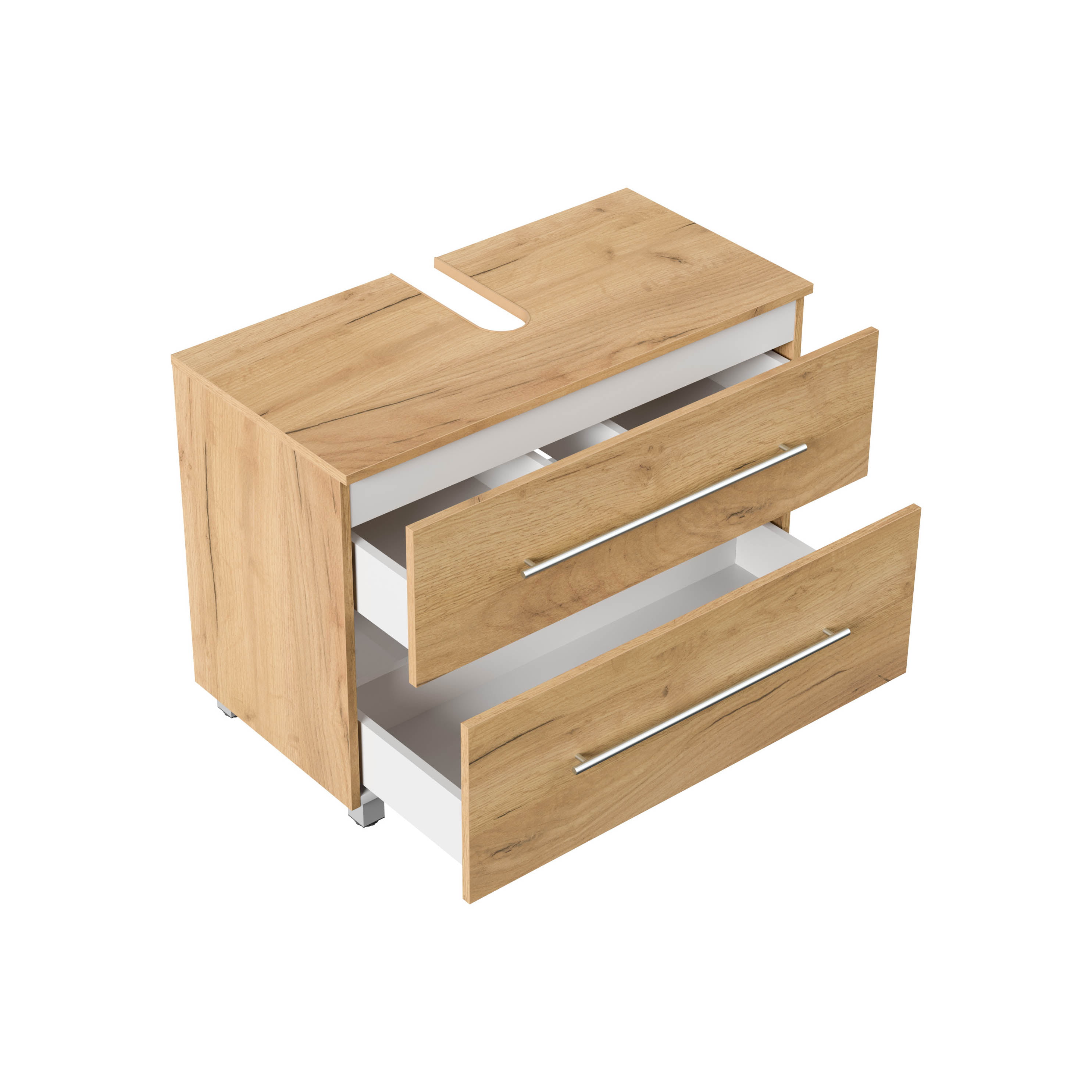 De wastafelkast Glasgow Eiken 85 cm brengt een warme en natuurlijke uitstraling in uw badkamer. Dit meubel, ontworpen in Duitsland en vervaardigd uit hoogwaardig spaanplaat, is afgewerkt in een realistische eiken Gold-look voor een authentieke houtuitstraling. Met afmetingen van 85 cm breed, 63 cm hoog en 41,6 cm diep, en voorzien van soft-close deuren en laden, biedt deze kast ideale opbergruimte voor uw badkamerbenodigdheden.