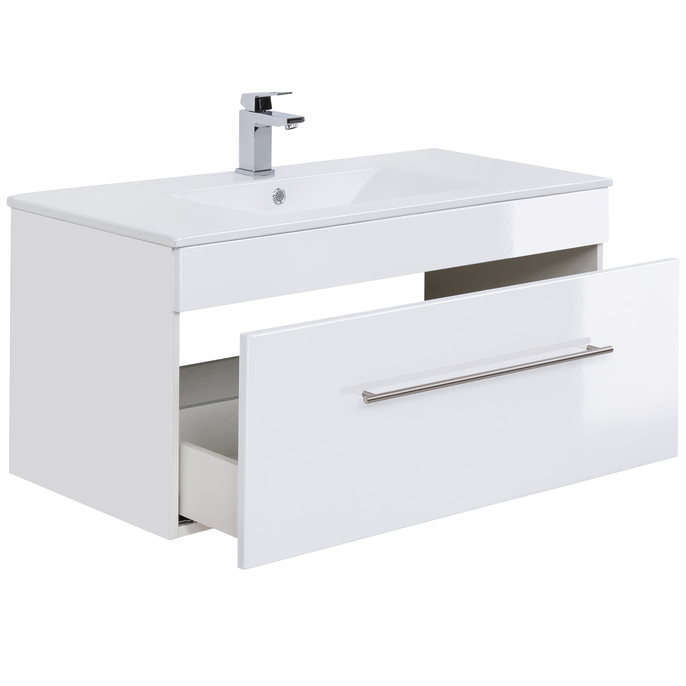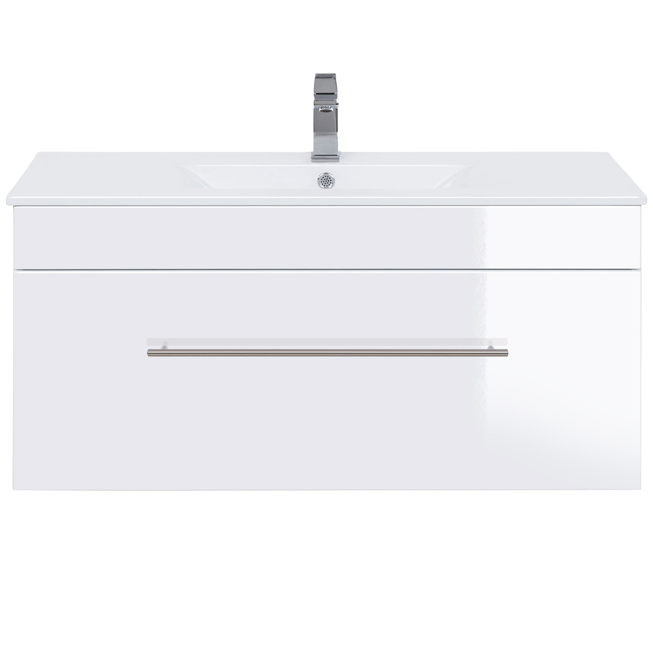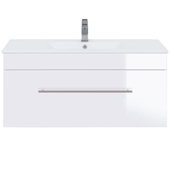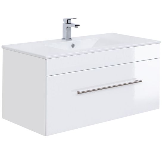 Deze wastafelkast heeft een breedte van 99cm, een hoogte 48cm en een diepte van 45,5cm. De wasbak met overloop heeft een breedte van 100cm en een diepte van 47,5cm. Onder de wastafel bevindt zich een ruime lade met soft-close systeem.
