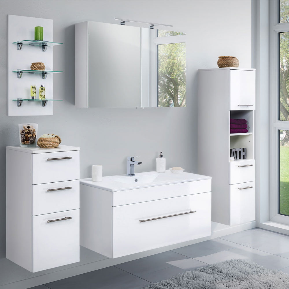 De panelen van de badkamermeubels zijn gemaakt van hoogwaardig stevig spaanplaat-materiaal (16MM) en zijn behandeld met een speciale coating om het materiaal tegen water te beschermen. De binnenkant van de lades en de kastjes zijn afgewerkt in melamine, ideaal om gemakkelijk schoon te maken! De handgrepen op de deuren en lades zijn gemaakt van massief roestvrijstaal die door het slanke design deze set een elegante uitstraling geeft. De meubels worden geproduceerd in Duitsland en zijn van zeer hoge kwaliteit die lang meegaan.