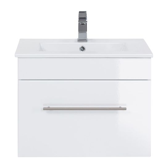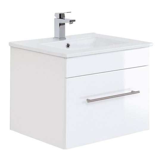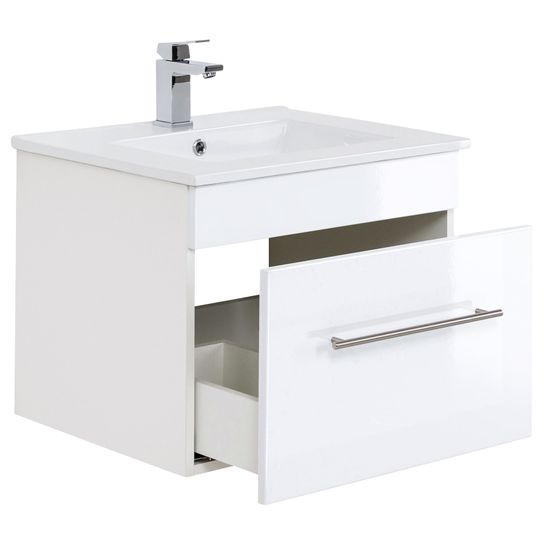 Deze wastafelkast heeft een breedte van 59cm, een hoogte 48cm en een diepte van 45,5cm. De wasbak met overloop heeft een breedte van 61,5cm en een diepte van 46,5cm. Onder de wastafel bevindt zich een ruime lade met soft-close systeem.