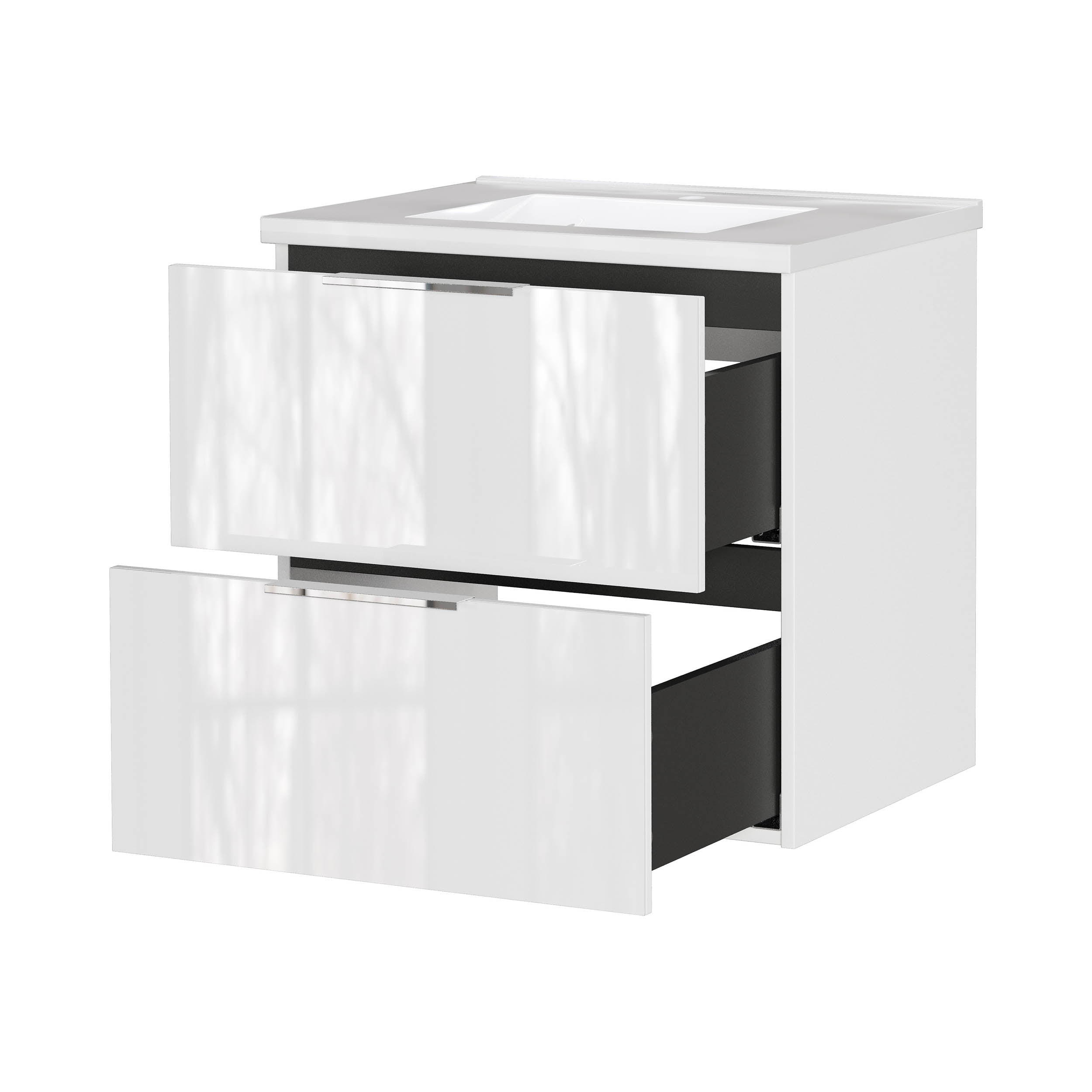 De twee lades zijn volledig uittrekbaar en dragen elk tot 10 kg. Dankzij softclose sluiten ze rustig en zonder geluid. De glazen fronten en metalen grepen geven het meubel een strak en tijdloos karakter. Door de wandmontage blijft de vloer vrij.