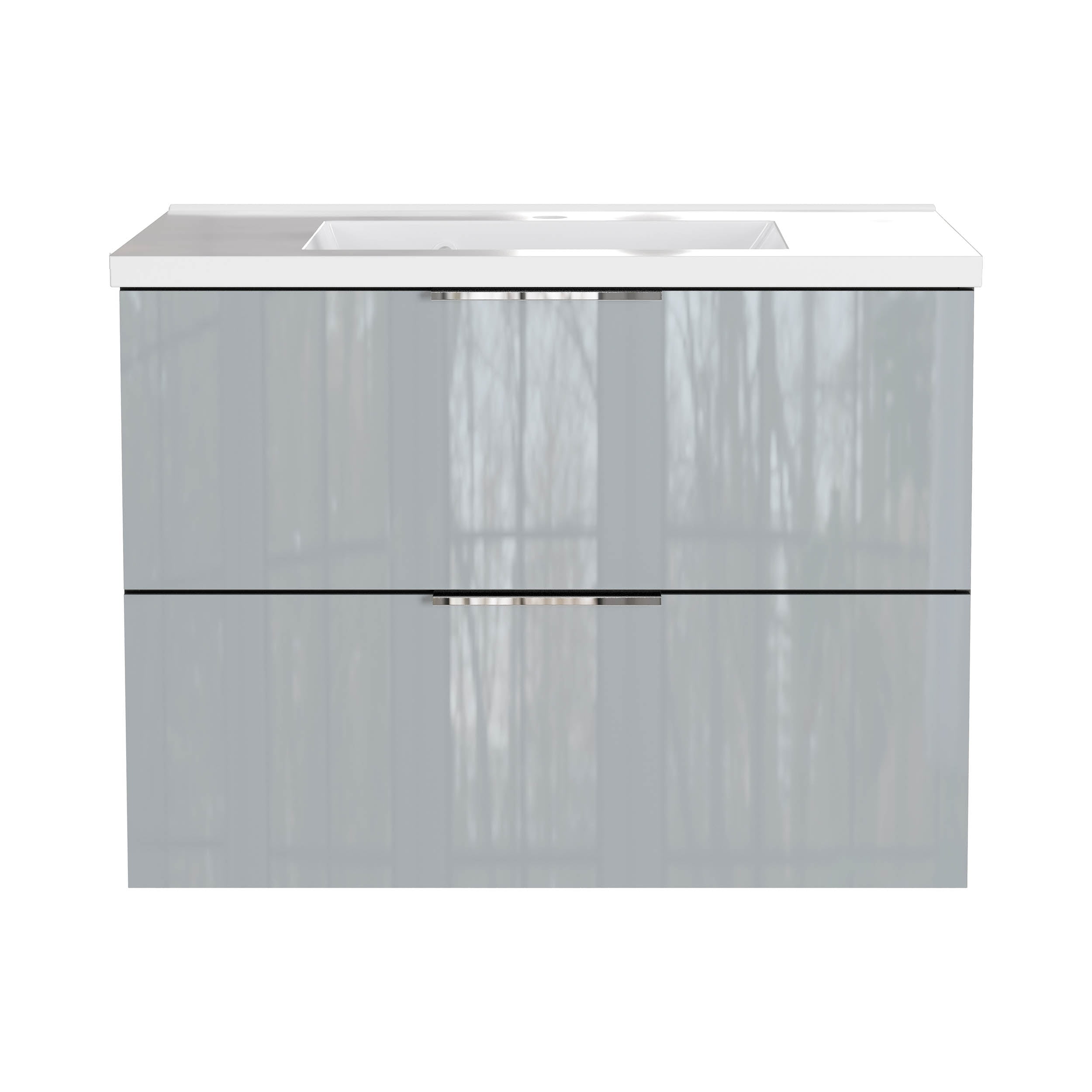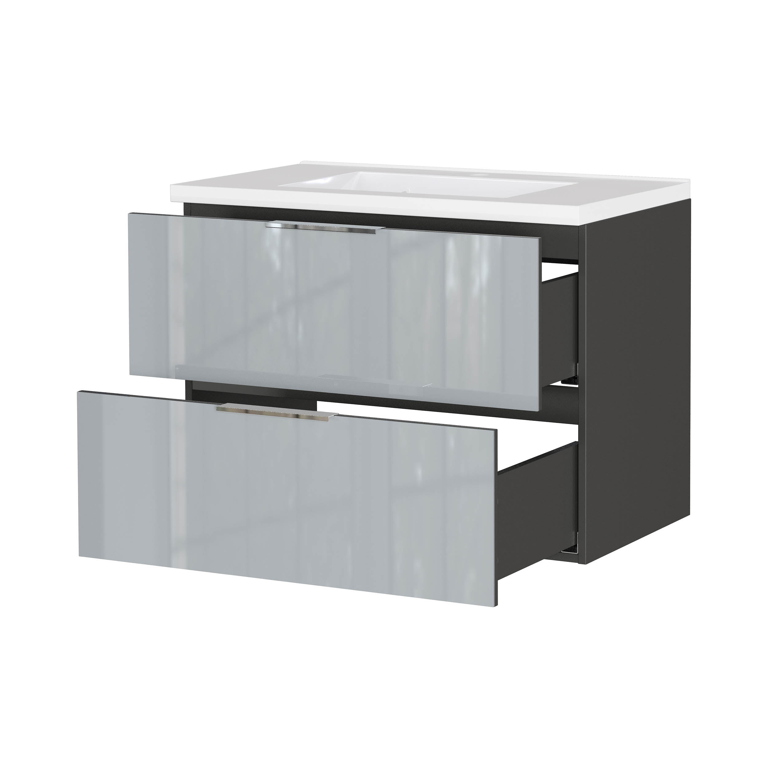 De twee lades zijn volledig uittrekbaar en belastbaar tot 10 kg per lade. Dankzij de geïntegreerde dempers sluiten ze soepel en geruisloos. De glazen fronten en chromen grepen zorgen voor een moderne uitstraling. Het wandhangende ontwerp houdt de ruimte open.