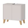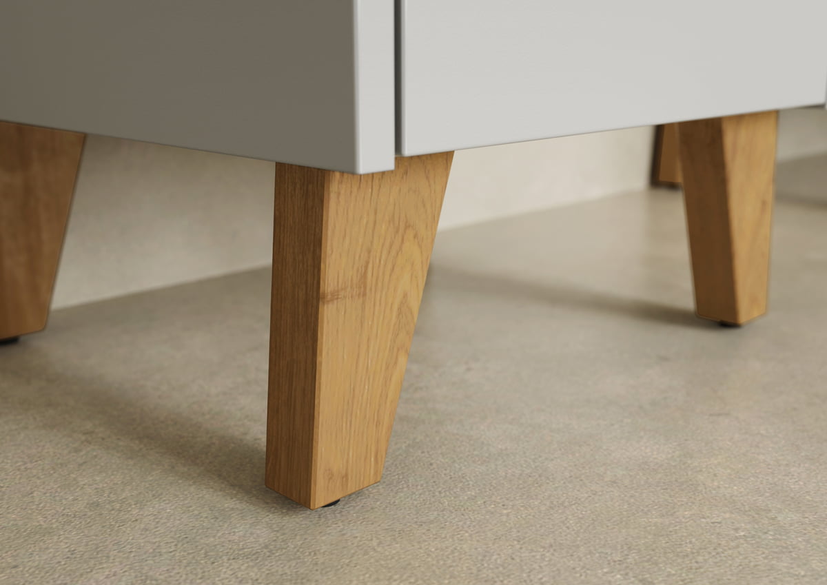 Deze wastafelkast is 60 cm breed, 59 cm hoog en 34 cm diep en past daardoor goed in een compacte badkamer. Het meubel staat op vier houten poten, wat zorgt voor een warme uitstraling en net wat meer karakter.