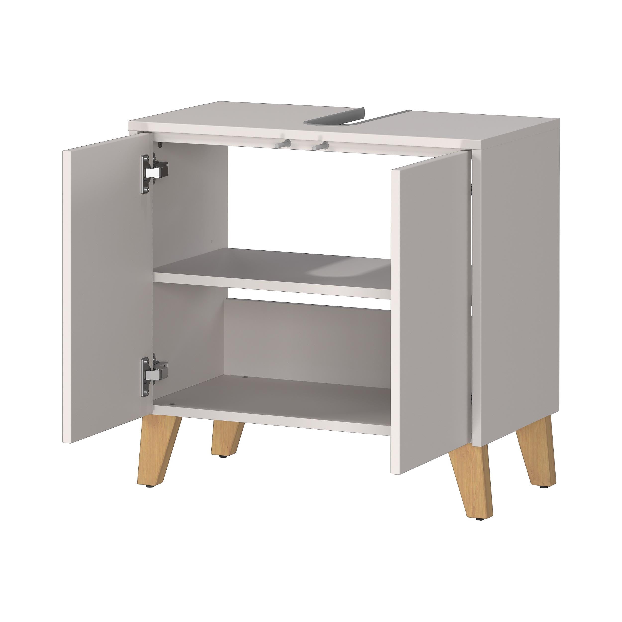 Achter de twee deuren bevindt zich een verstelbare plank met een draagkracht tot 10 kg. Het bovenblad is eveneens belastbaar tot 10 kg en heeft een uitsparing voor de sifon, zodat alles netjes aansluit. Dankzij de deurdemping sluiten de deuren rustig en zonder harde klap. Het greeploze ontwerp met push-to-open houdt het geheel strak.