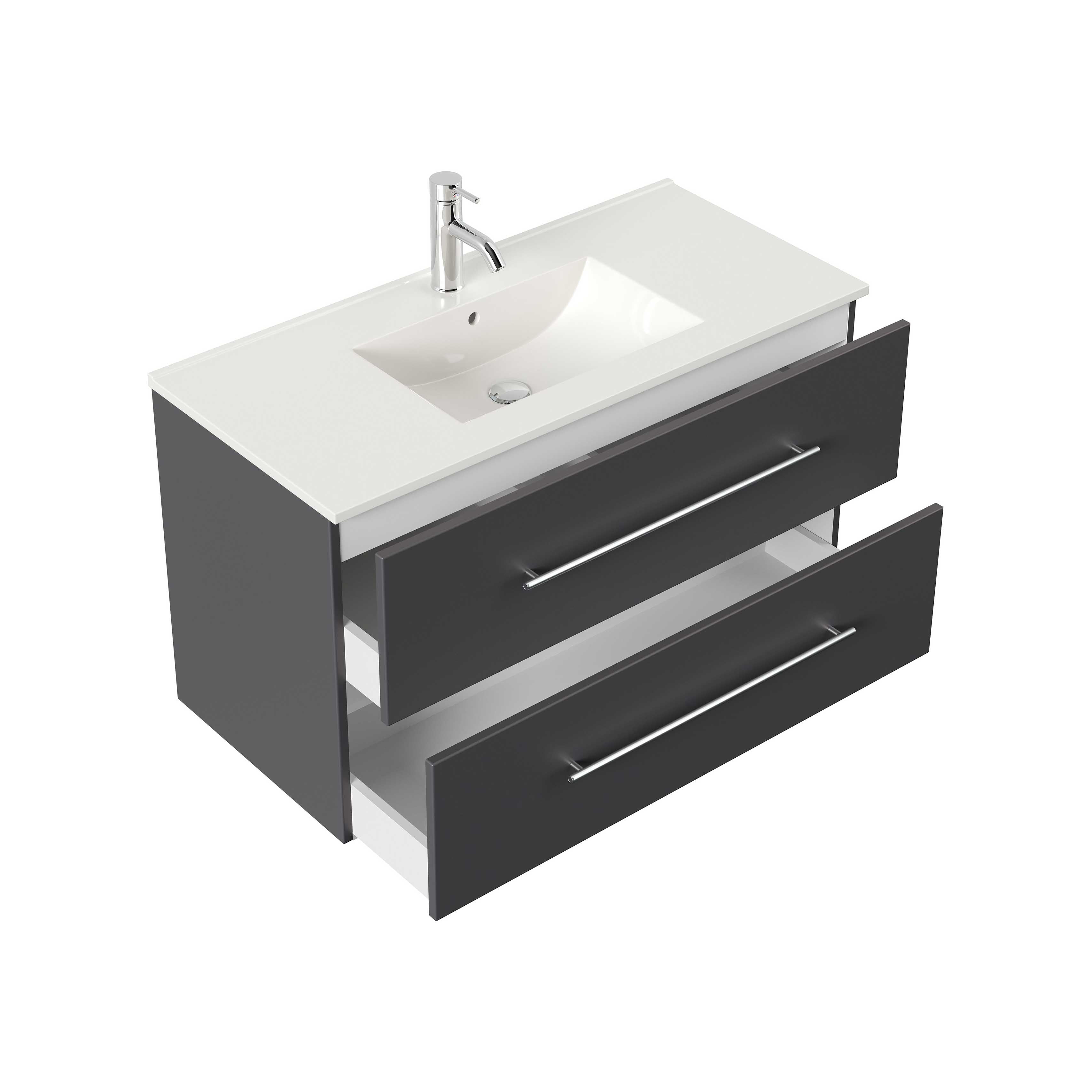 Deze wastafelkast is door zijn strakke design toepasbaar in elke badkamer. De binnen- en buitenkanten van de lades en kastjes zijn afgewerkt met een sterke melamine, ideaal om gemakkelijk schoon te maken! De handgrepen van de lades zijn gemaakt van mat geborsteld RVS die door het slanke design deze set een elegante uitstraling geeft. De meubels worden geproduceerd in Duitsland en zijn van zeer hoge kwaliteit die lang meegaan. De wastafelkast wordt geleverd exclusief kraan, toevoerleidingen naar de kraan, afvoerplug en zwanenhals. Onder de wastafel bevinden zich 2 ruime lades met soft-close systeem. De wastafelkast is afgewerkt in hoogglans antraciet en is 100cm breed, 54cm hoog en 46cm diep.