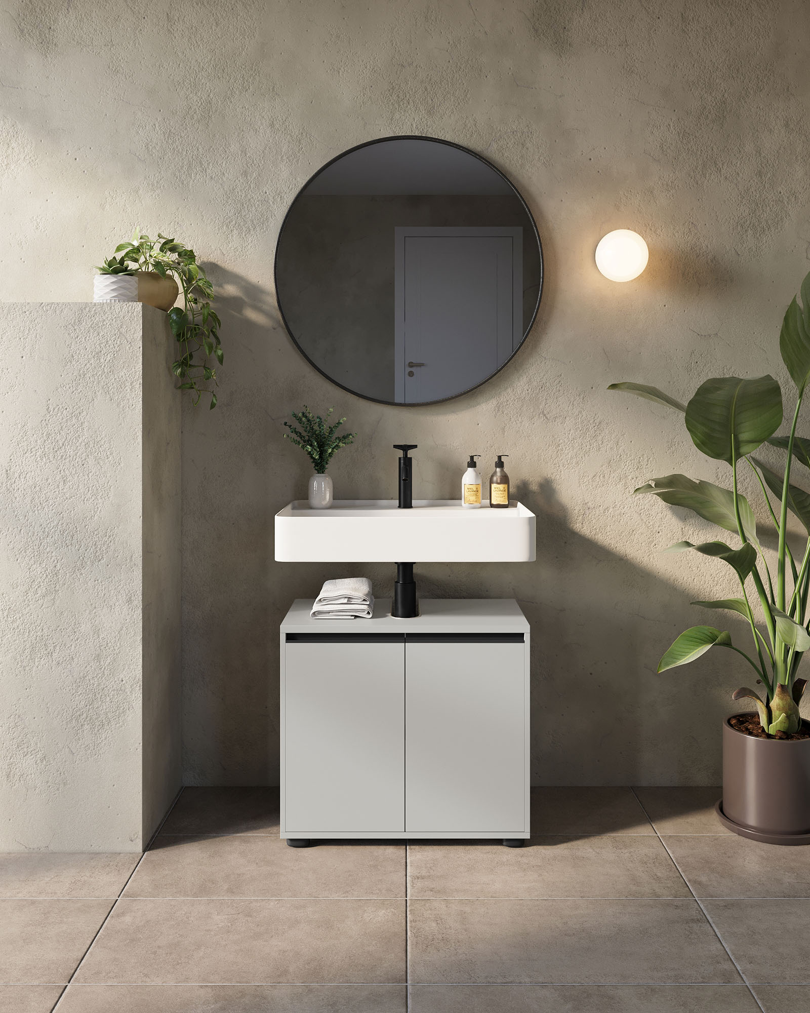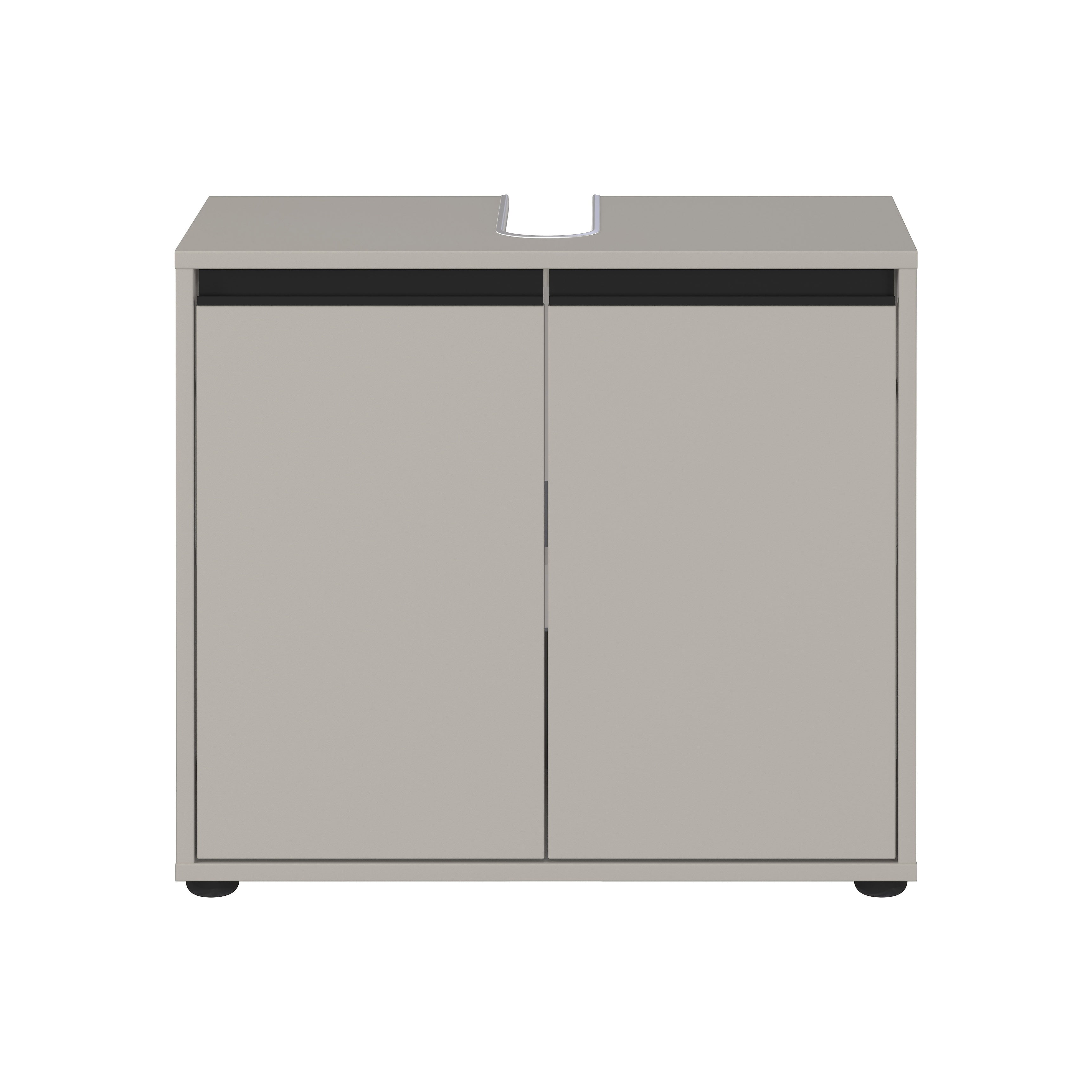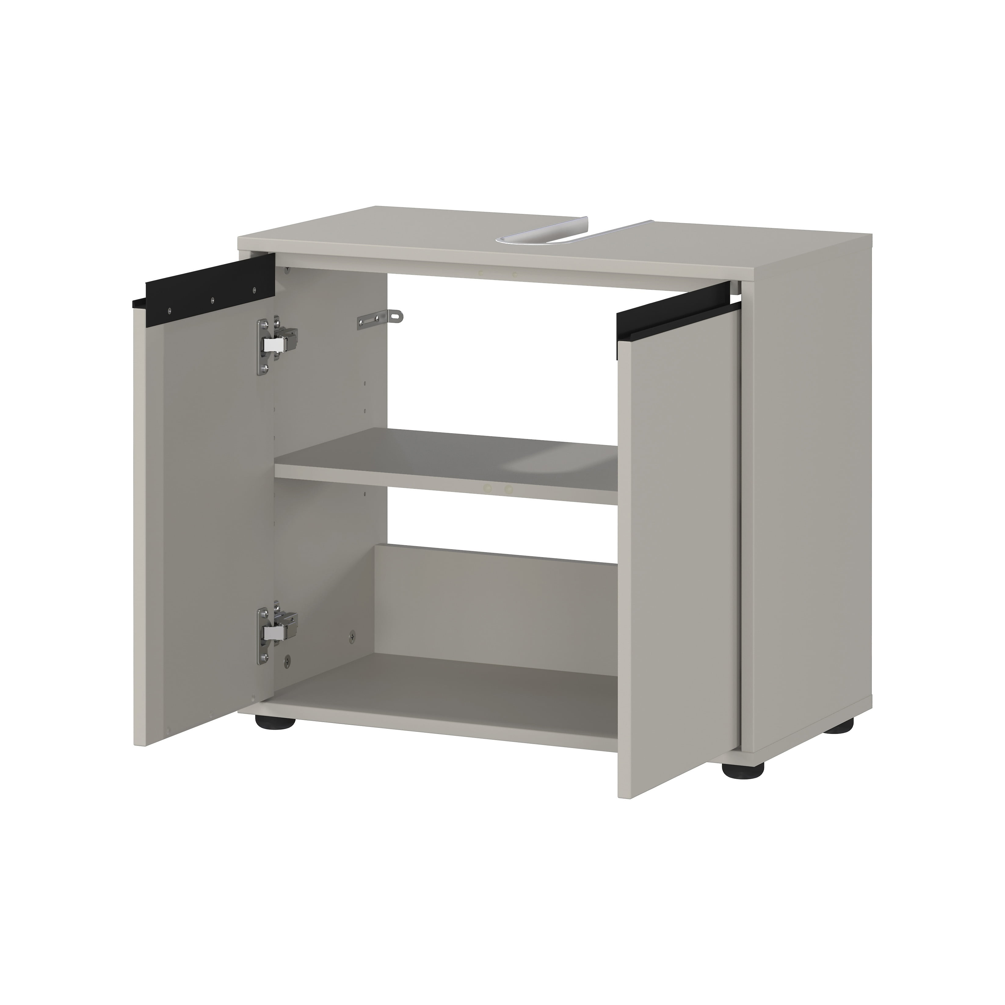 De wastafelkast Pula Lichtgrijs 63 cm is een praktische en stijlvolle oplossing voor extra opbergruimte in de badkamer. Dit meubel heeft twee deuren met daarachter een verstelbare plank, die belastbaar is tot 10 kg. Het bovenpaneel bevat een uitsparing voor de sifon en kan tot 3 kg dragen, terwijl de onderste plank tot 10 kg belastbaar is. De kast is voorzien van twee zwarte metalen handgrepen en staat op vier stevige kunststof meubelglijders. De krasbestendige melamine coating en stootvaste ABS-randen zorgen voor een lange levensduur, terwijl de geïntegreerde demping een geruisloos sluitmechanisme garandeert.
