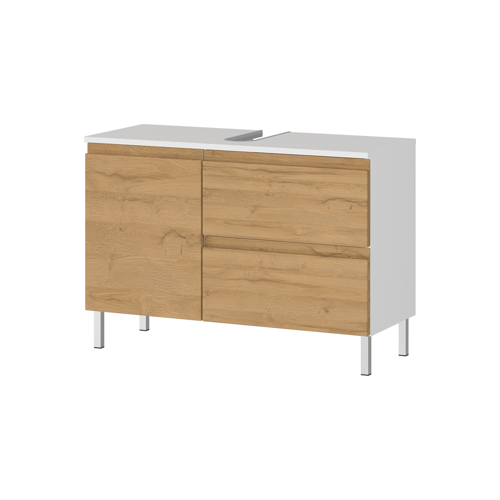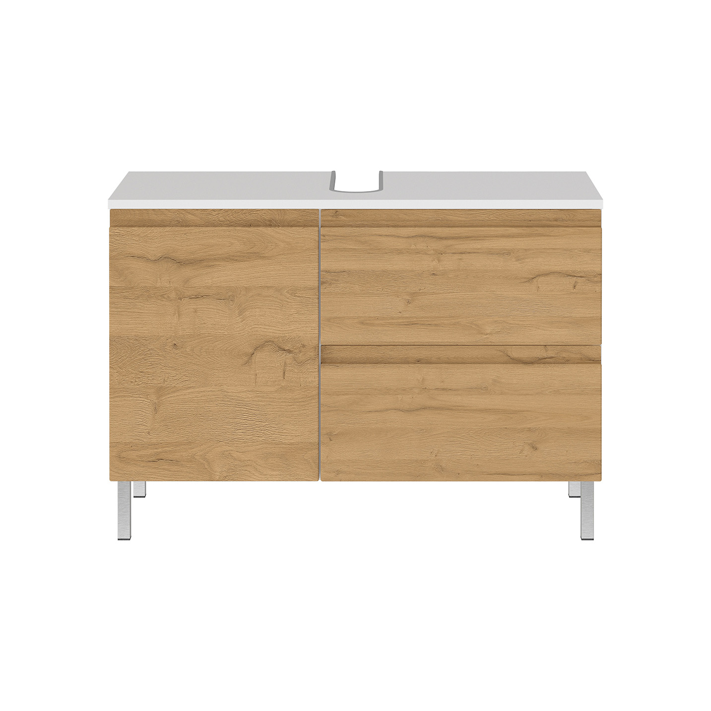 De Wastafelkast Samos Eiken 80 cm combineert functionaliteit en elegantie in een eigentijds ontwerp dat perfect past bij elke badkamerstijl. Met een slimme indeling biedt deze wastafelkast voldoende opbergruimte met een flap aan de rechterkant, een lade eronder en een deur aan de linkerkant, met daarachter een verstelbare plank. De topplank is voorzien van een uitsparing voor de sifon, waardoor je optimaal gebruik kunt maken van de beschikbare ruimte.