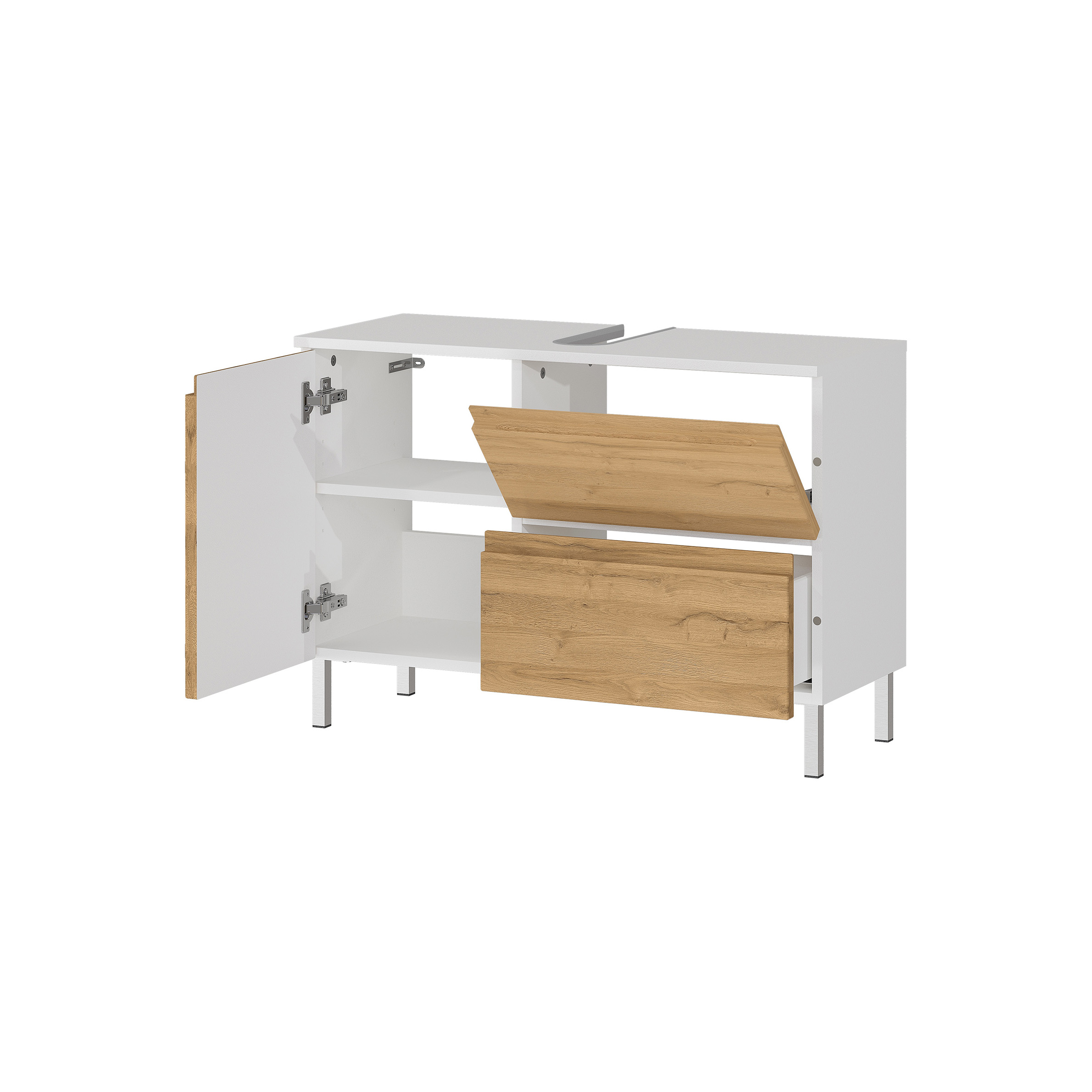 Het tijdloze design van de Wastafelkast Samos Eiken 80 cm wordt versterkt door de combinatie van een witte body en fronten in grandson-eiken repro. De handgreeploze uitvoering zorgt voor een strakke en moderne uitstraling, terwijl de melamineharscoating en hoogwaardige ABS-randen zorgen voor een krasbestendige en duurzame afwerking.