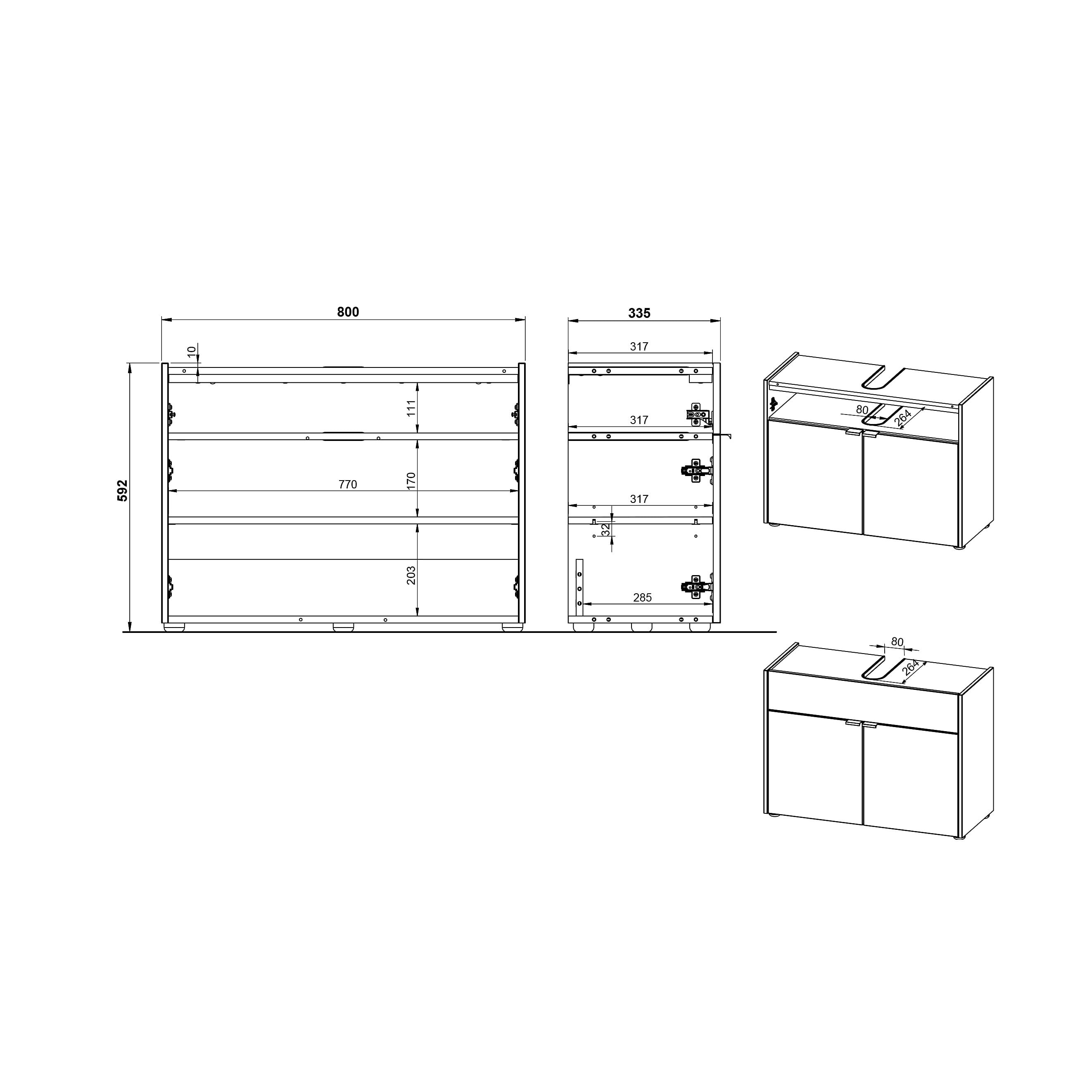 De bovenste plank en het compartiment achter de klep hebben beiden een uitsparing voor de sifon, waardoor je optimaal gebruik kunt maken van de beschikbare ruimte. De onderste plank is belastbaar tot 10 kg en biedt ruimte voor extra handdoeken of andere benodigdheden.