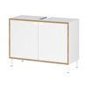De kast heeft twee deuren en binnenin zit één plank (belastbaar tot 10 kg) voor extra indeling. Het bovenblad heeft een uitsparing voor de sifon en kan tot 5 kg dragen, het onderste deel tot 10 kg. De twee metalen grepen en de vier metalen pootjes zijn wit gecoat en geven het meubel een nette, rustige uitstraling.