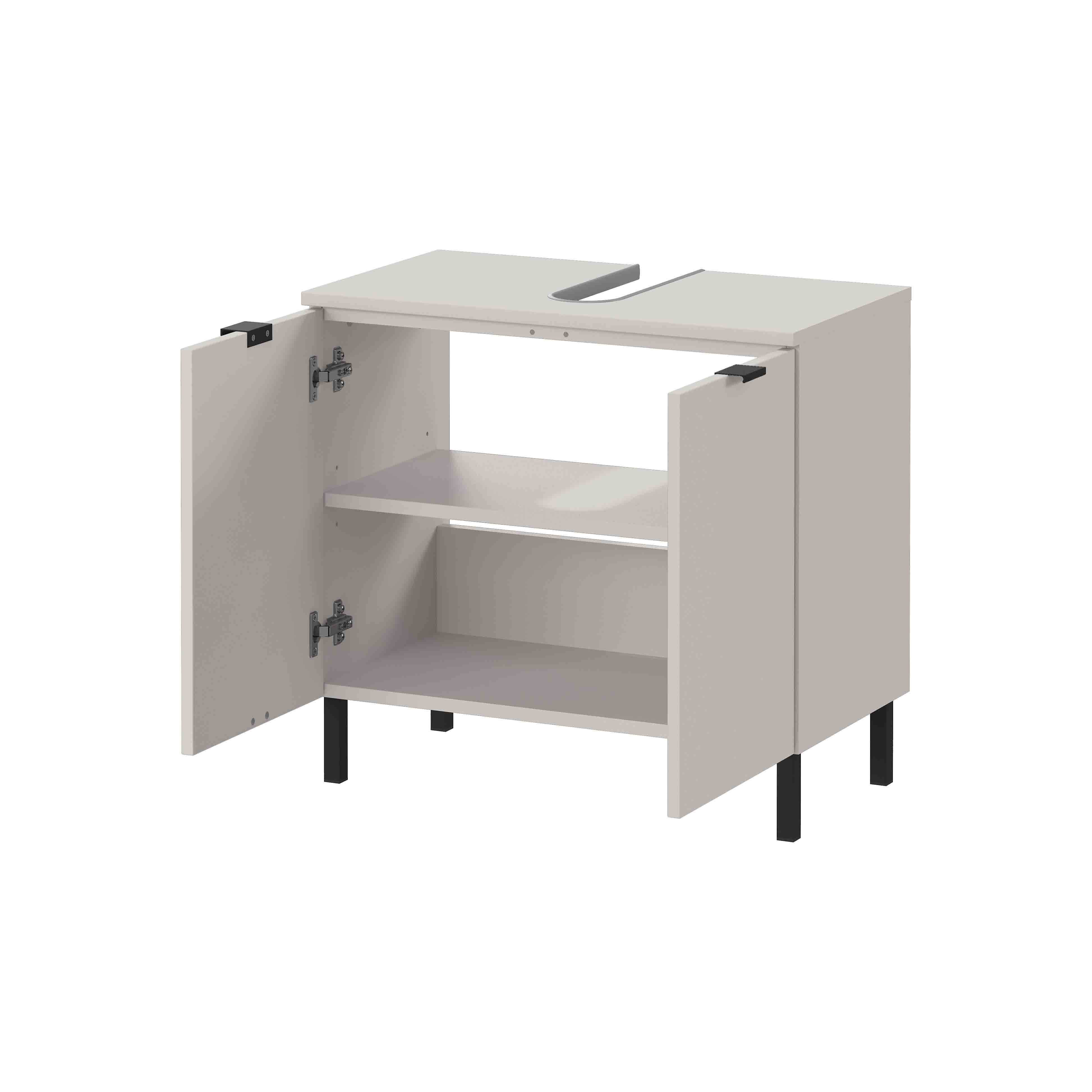 Het moderne cashmere ontwerp in combinatie met de zwarte metalen randgrepen en voeten geeft een tijdloze en elegante uitstraling. Dankzij het soft-close mechanisme sluiten de deuren zacht en geruisloos, wat het gebruik comfortabel maakt. De kast is milieuvriendelijk geproduceerd in Duitsland en wordt geleverd zonder polystyreen verpakking, zodat je ook een verantwoorde keuze maakt voor je interieur.