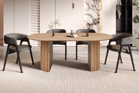 De **Eetkamertafel Odile Oudeiken** in ovale vorm is verkrijgbaar in verschillende maten. De 200 cm lange tafel biedt voldoende ruimte voor familiediners en gezellige maaltijden met vrienden. Het stevige MDF onderstel en het ruime tafelblad zorgen voor een betrouwbare basis, ideaal voor het creëren van een gezellige eethoek.